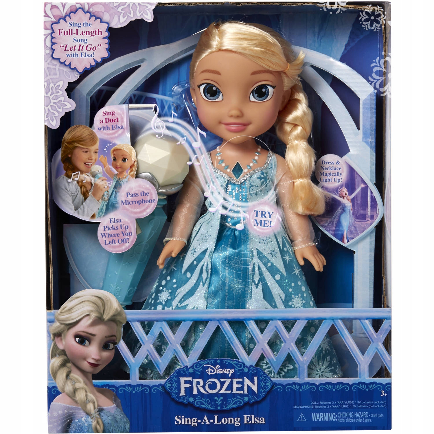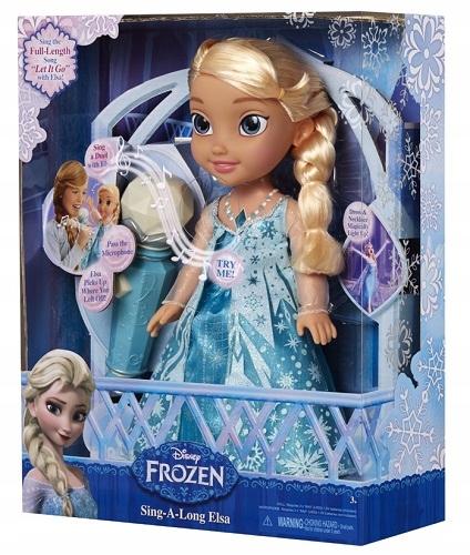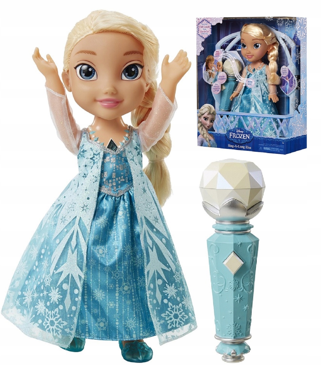 Śpiewająca lalka Elsa z bajki Kraina Lodu (Frozen). Elsa ubrana jest w piękną, baśniową suknię, posiada mikrofon. Została wyposażona w funkcję Royal Reflection Eyes, czyli trójwymiarowe oczy w których dostrzec można blask marzeń. Do lalki dołączone są zdejmowane pantofelki. Jej wysokość to 36 cm.
