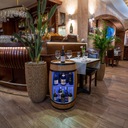 Podświetlenie zamontowane w beczce zasilane jest zasilaczem 230/12V. Dzięki bezprzewodowemu pilotowi i zastosowniu światełek LED RGB możliwe jest zdalne sterowanie zarówno poziomem jasności jak i kolorem podświetlenia. Pilot zawiera 7 kolorów do wyboru oraz tryby automatycznego przechodzenia z jednego koloru w następny. Dzięki oświetleniu możemy zajrzeć w zakamarki naszego barku i wybrać idealny trunek na daną okajzję.