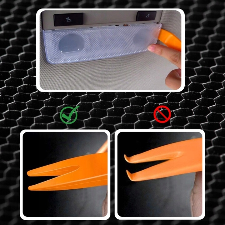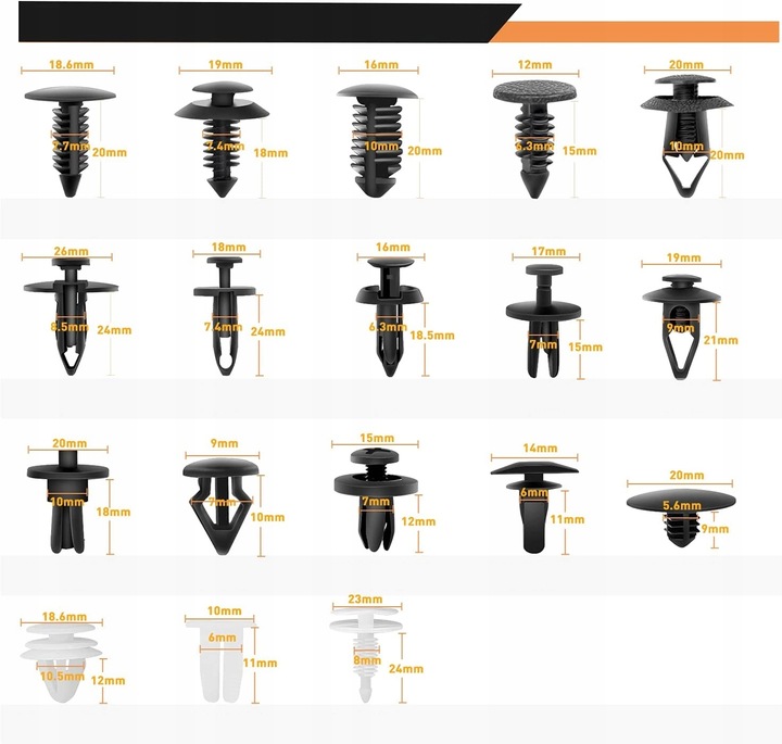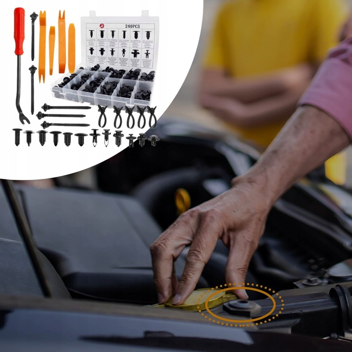 Kompatybilny z różnymi typami pojazdów, pozwala na mocowanie różnych elementów w samochodzie. W skład zestawu wchodzą różnego rodzaju elementy mocujące takie jak spinek, kołków, klipsów i zatrzasków, które pozwolą na przymocowanie tapicerki, elementów plastikowych, zderzaków i uszczelek w pojeździe.