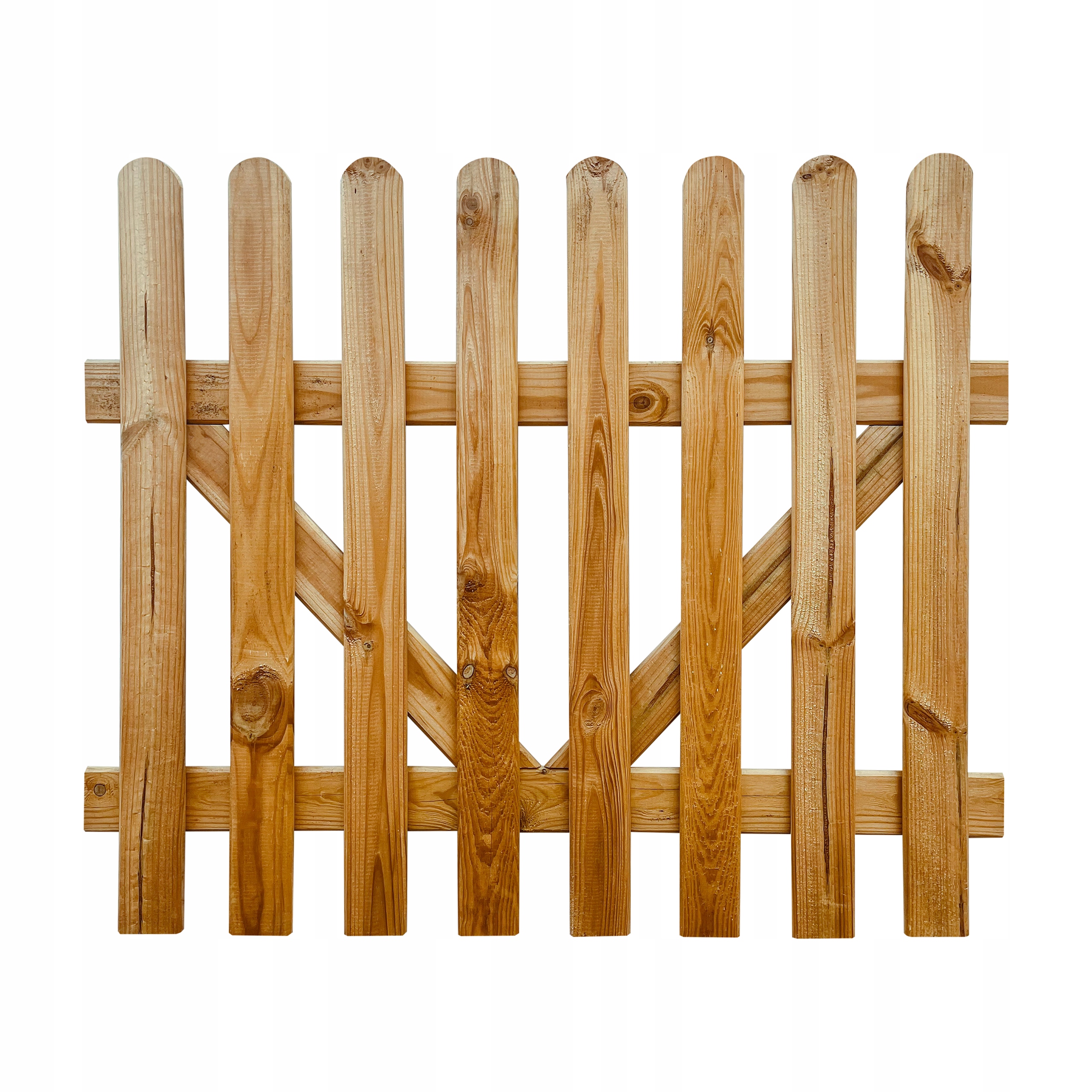 Prosty płot sztachetowy wykonany z sosnowych desek struganych z zaokrąglonym wykończeniem.