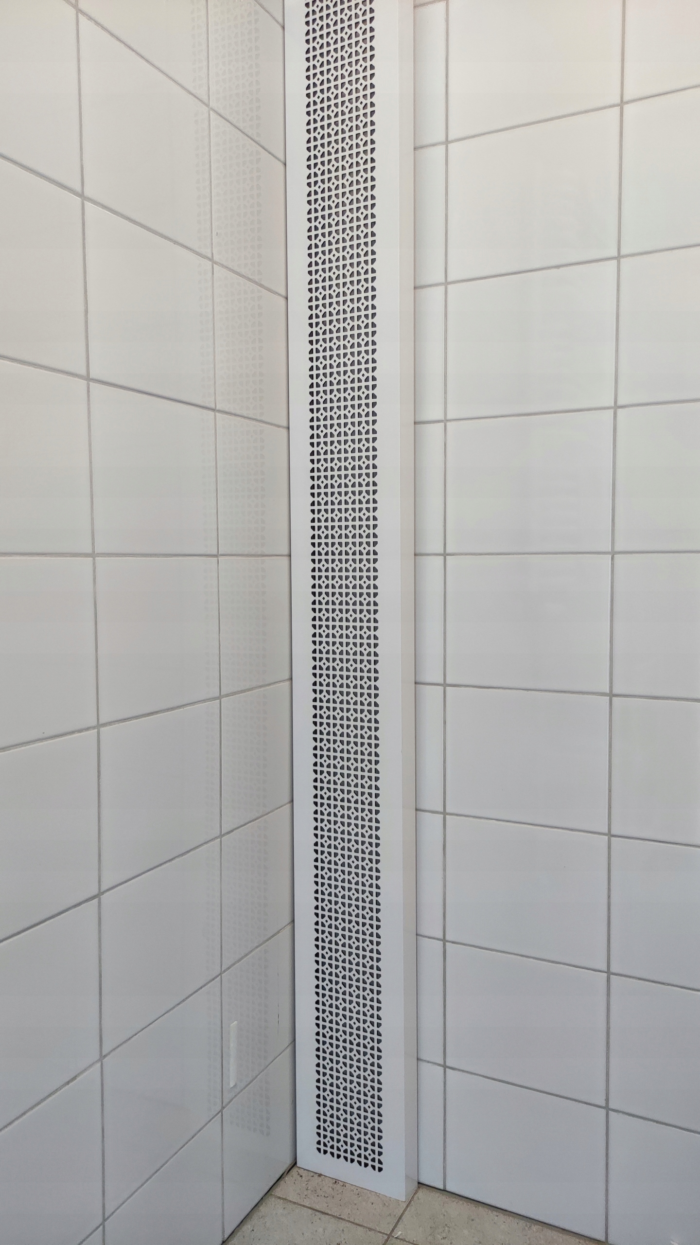 Osłona ażurowa wykonana z ALUCBONDU gr. 3mm Materiał jest odporny na temperaturę, nie blokuje przepływu ciepła i jest wyjątkowo wytrzymały.