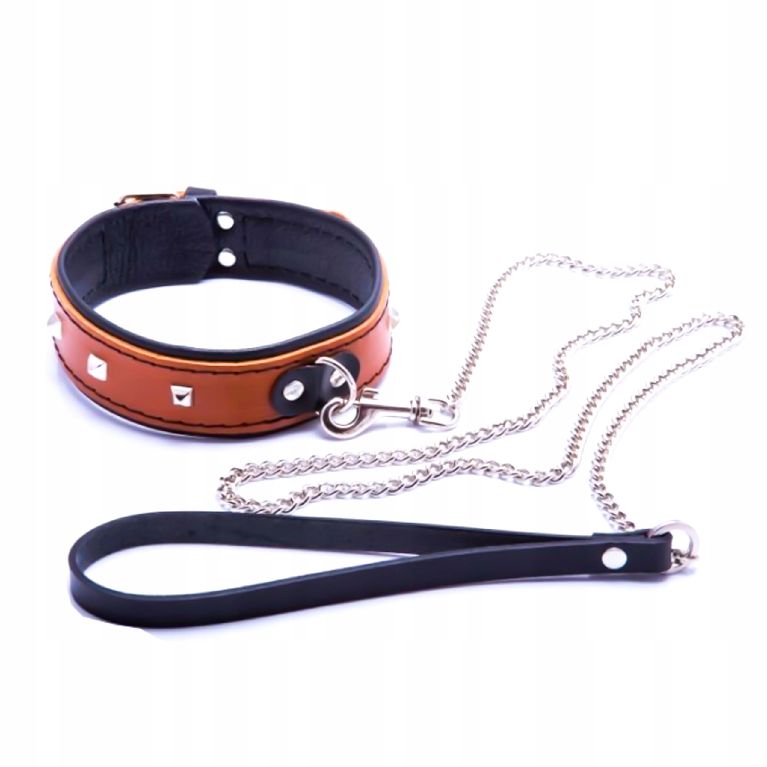 Skórzana obroża damska w kolorze koniakowym, nabijana ćwiekami ze smyczą.