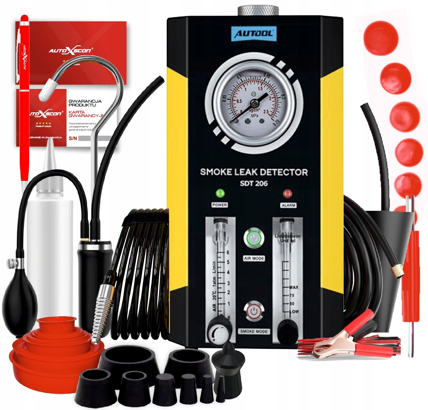 Profesjonalny automatyczny tester szczelności rur, węży, złączy, instalacji przy użyciu generatora dymu. Pomoże nam to w szybkim i dokładnym zlokalizowaniu wycieków w układach rurowych w ciągu kilku minut. Możliwość wykorzystania urządzenia przy testach układu dolotowego, test turbosprężarki, test układu wydechowego, test układu chłodzenia, test uszczelnienia samochodu, test układu zbiornika paliwa, test różnych złączek rurowych