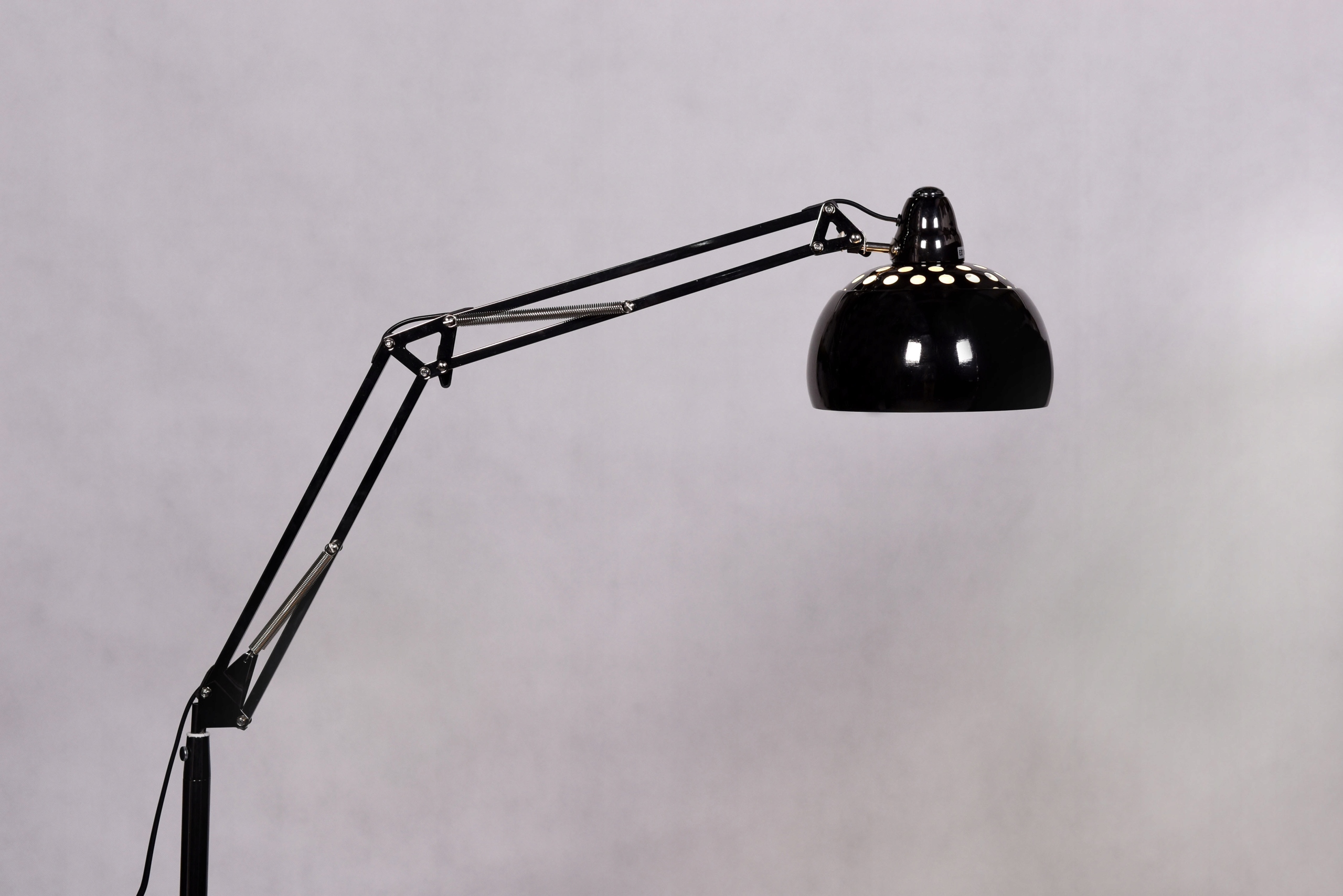 Czarna lampa podłogowa o regulowanym ramieniu to oryginalna propozycja oświetlenia dla pracowni, salonów i sypialni. Design górnej części przypomina nowoczesne lampki biurowe, z tą różnicą, że został osadzony na długim wysięgniku, który efektownie kontrastuje z niewielkim półkolistym kloszem. Wykonanie z jakościowego metalu zapewnia czarnemu modelowi wysoką funkcjonalność i pełną stabilność.