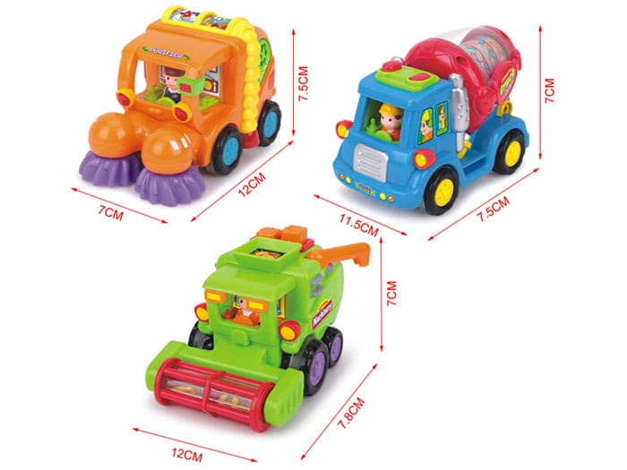 Pojazdy z napędem przeznaczone są dla najmłodszych pociech. Autka wyposażone są w wolny napęd, który sprawia że każdy z pojazdów samodzielnie jedzie do przodu.