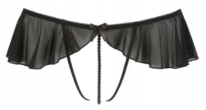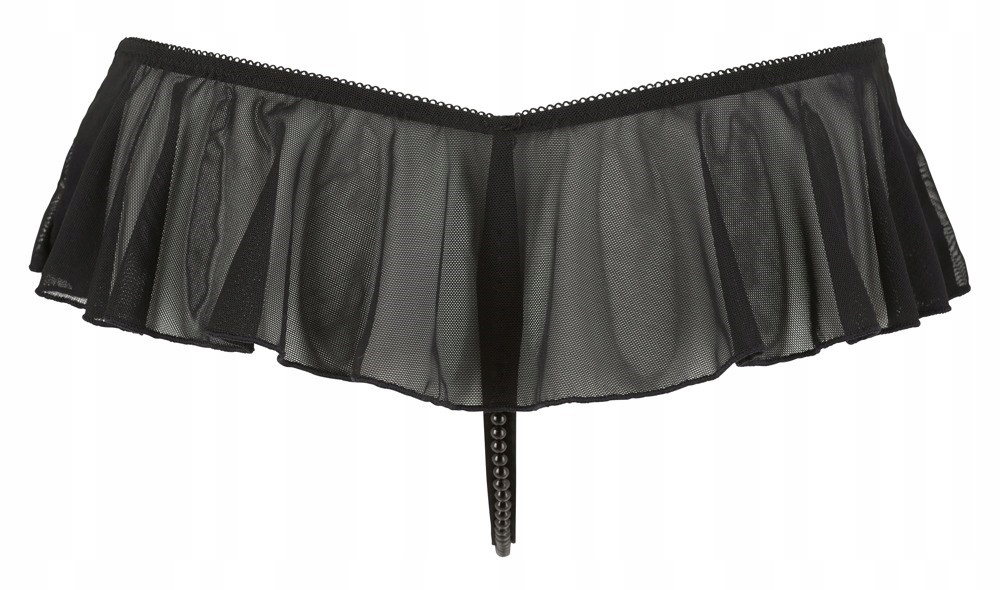 Stringi marki Cottelli Collection Lingerie. Zamiast trójkąta tkaniny są tylko dwa elastyczne paski i sznur pereł w kroczu. Z półprzezroczystą, podkreślającą sylwetkę falbanką.