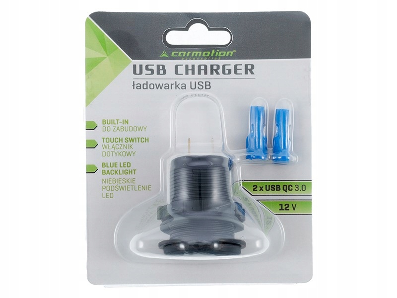 Ładowarka USB, wyposażona w 2xUSB Quick Charge 3.0, włącznik dotykowy z niebieskim podświetleniem.