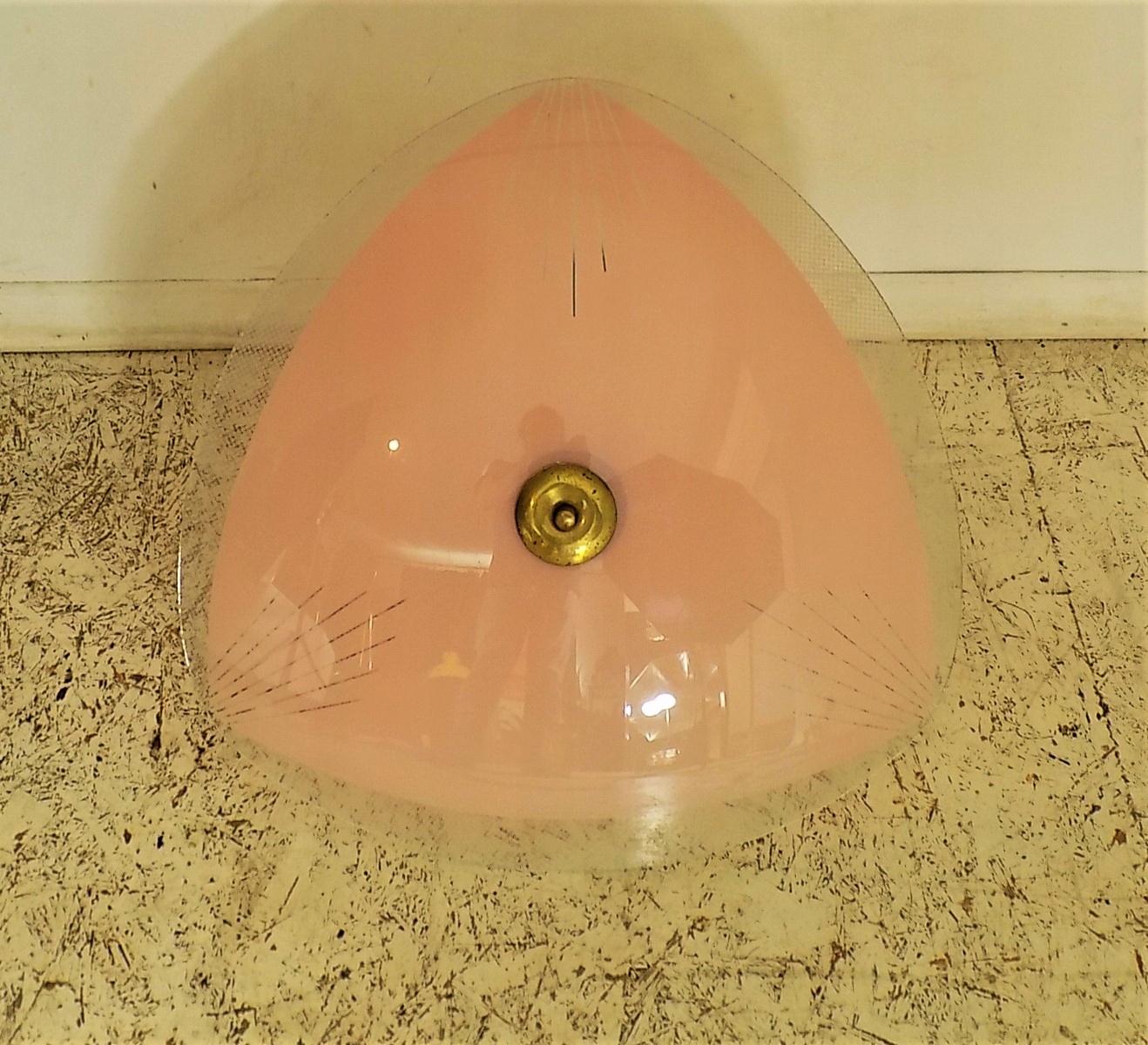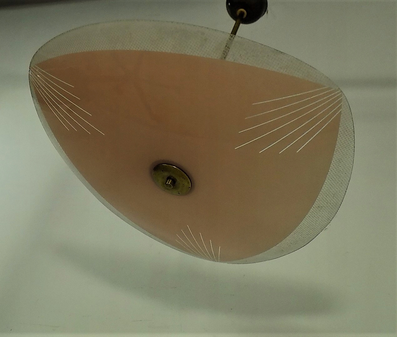 Efektowny żyrandol wykonany ze szkła i mosiądzu. Klosz malowany metodą natrysku wybieranego w abstrakcyjny wzór new look. Dwa punkty świetlne - oprawki tradycyjne na ''duży gwint". Minimalny (niemal niewidoczny) uszczerbek na rancie