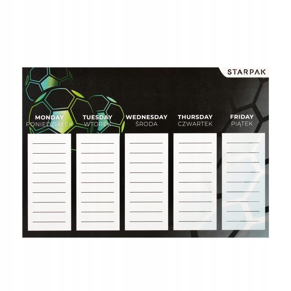 Plan lekcji jest niezbędnym elementem wyposażenia szkolnej wyprawki. Plan z kolekcji Starpak z grafiką z motywem piłki nożnej - idealny dla małego fana footballu, zawiera podział na pięć dni tygodnia z 9 wierszami do wpisu, dzięki czemu żaden uczeń nie zapomni o potrzebnych mu danego dnia książkach czy zeszytach. Przyjazna grafika sprawi, że każdy dzień w szkole będzie dobrze zaplanowany i udany. Zapoznaj się również z innymi produktami Starpak! Plan lekcji wykonany z papieru. Wyprodukowany w Polsce