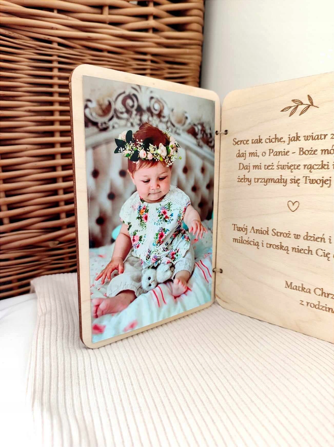 Personalizowana drewniana kartka to niebanalny pomysł na wręczenie pieniędzy z okazji Chrztu Świętego.