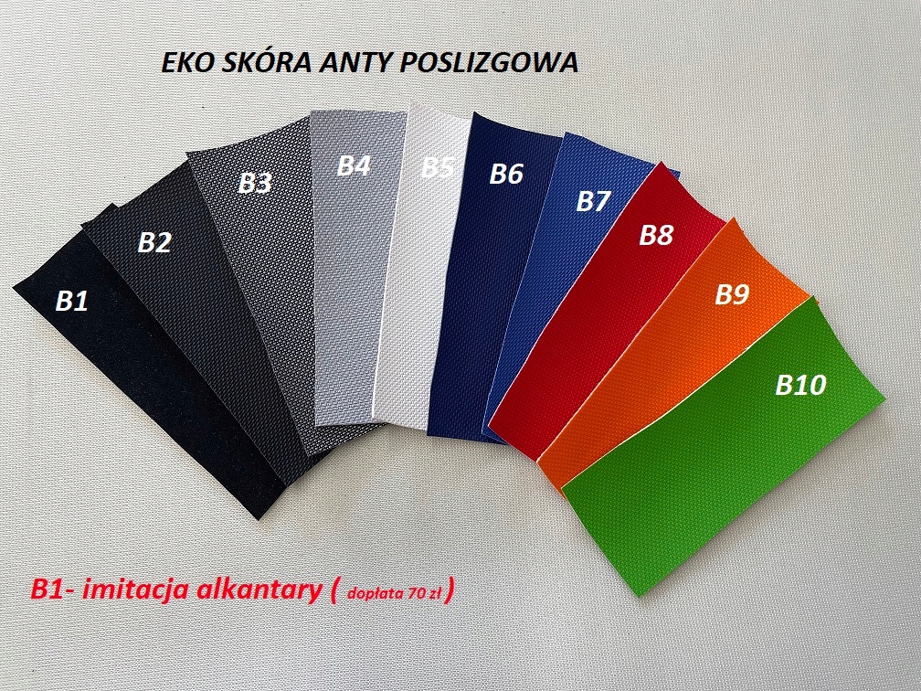 Standardowo pokrowiec wykonujemy z eko-skóry na bocznych elementach oraz z materiału antypoślizgowego na środkowych elementach.