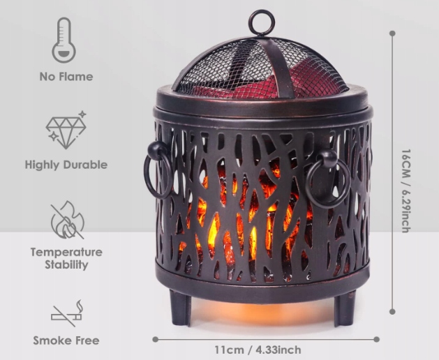 Ten metalowy podgrzewacz woskowy wykorzystuje elektryczne ogrzewanie płyty grzewczej i łączy mentalną ramę i przezroczyste szkło. Światło tworzy model ogniska, który wygląda jak prawdziwy Fire Pit.