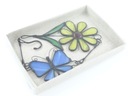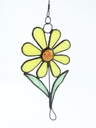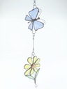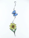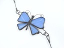 Zawieszka wykonana w technice Tiffany'ego z wysokiej jakości szkła witrażowego. Motyl i kwiat wykonane zostały ze szkła częściowo przeziernego, dzięki czemu delikatnie rozpraszają światło. Ozdoba będzie pięknie prezentować się na zazdrostce okiennej, kinkiecie lub półce. Haczyk umożliwia wygodny montaż. Elementy zawieszki patynowane w głębokiej czerni. Długość zawieszki ok. 43 cm. Maksymalna szerokość elementów do 8 cm. Kolory szkła: niebieski, żółty i zielony częściowo przezierny. Kaboszon brązowy przezierny.
