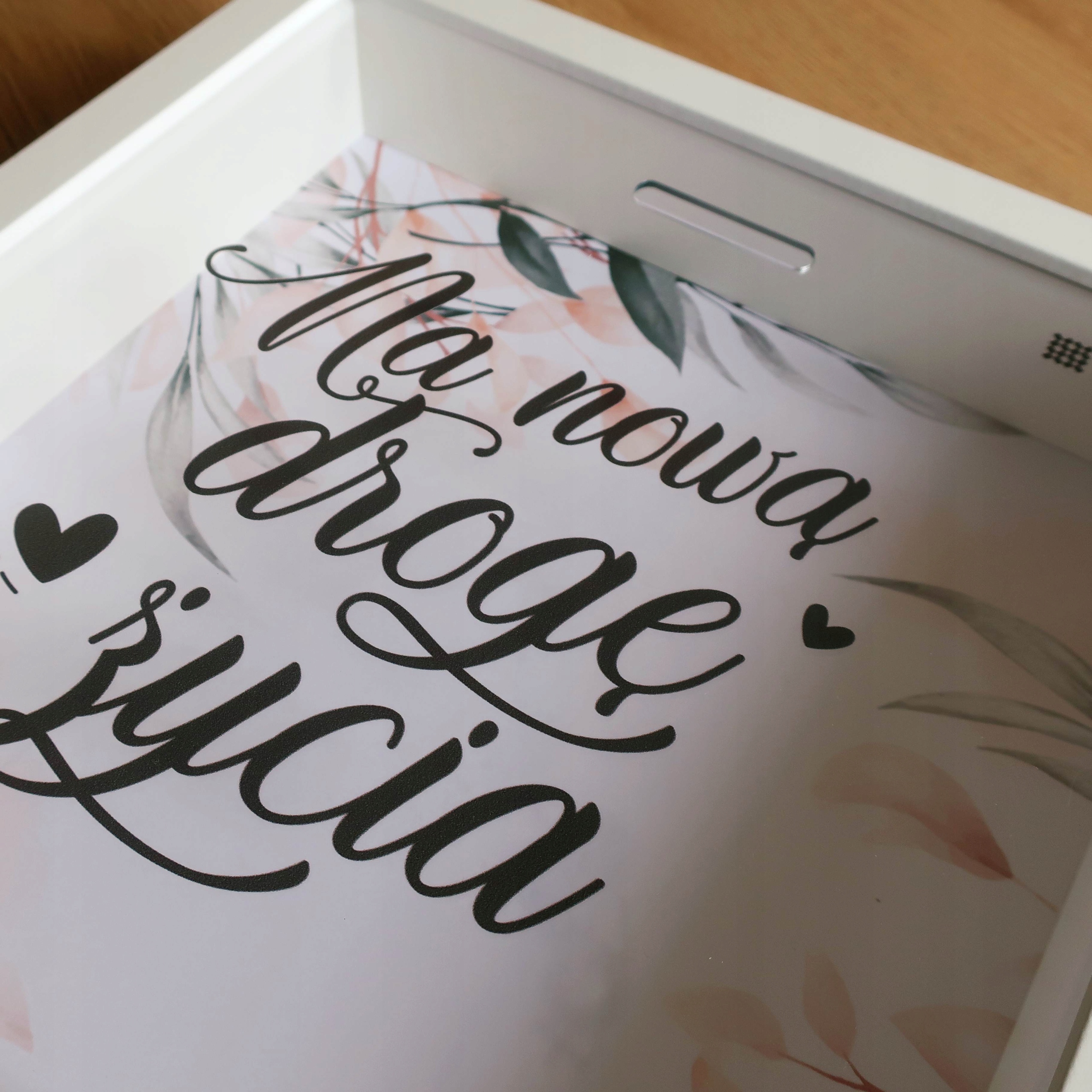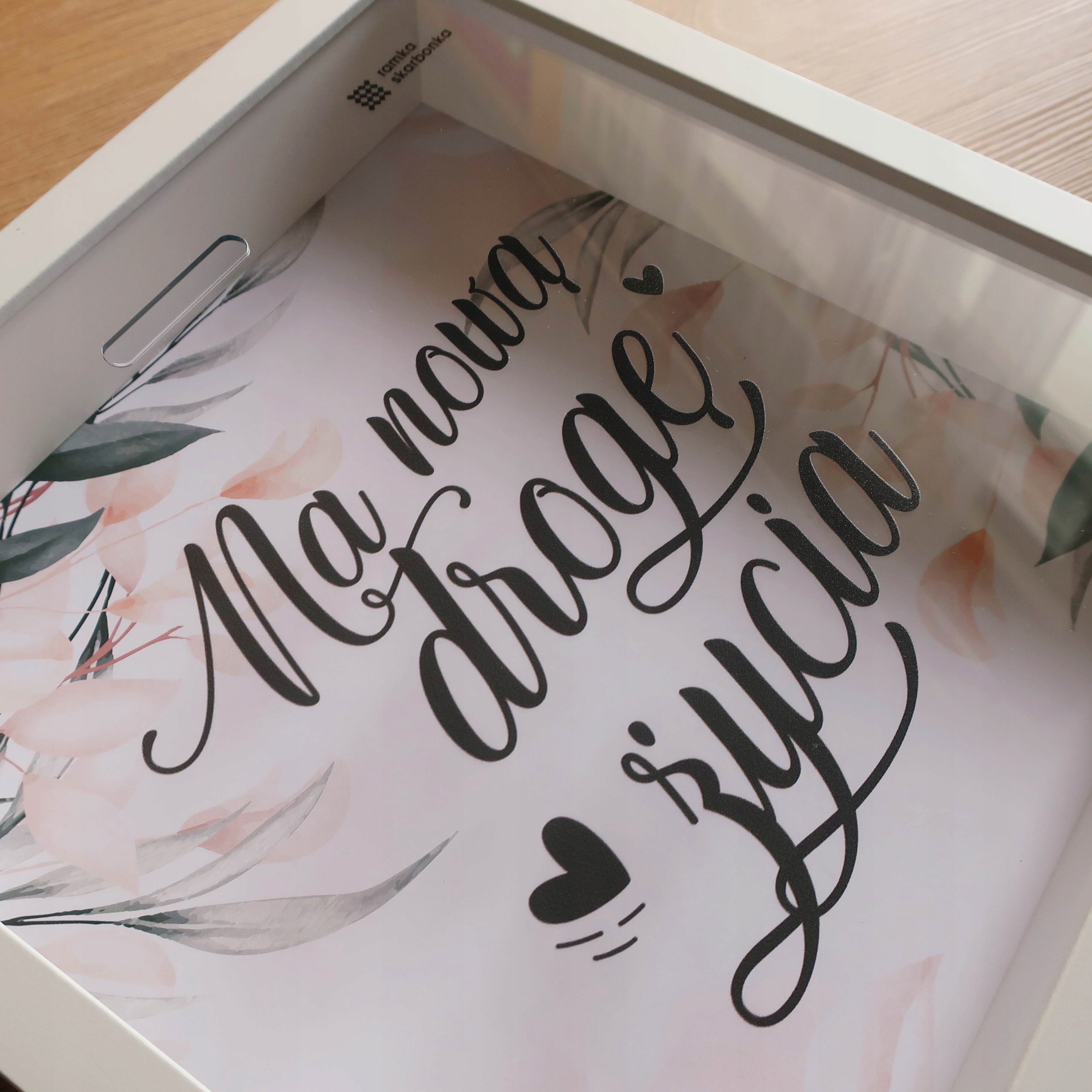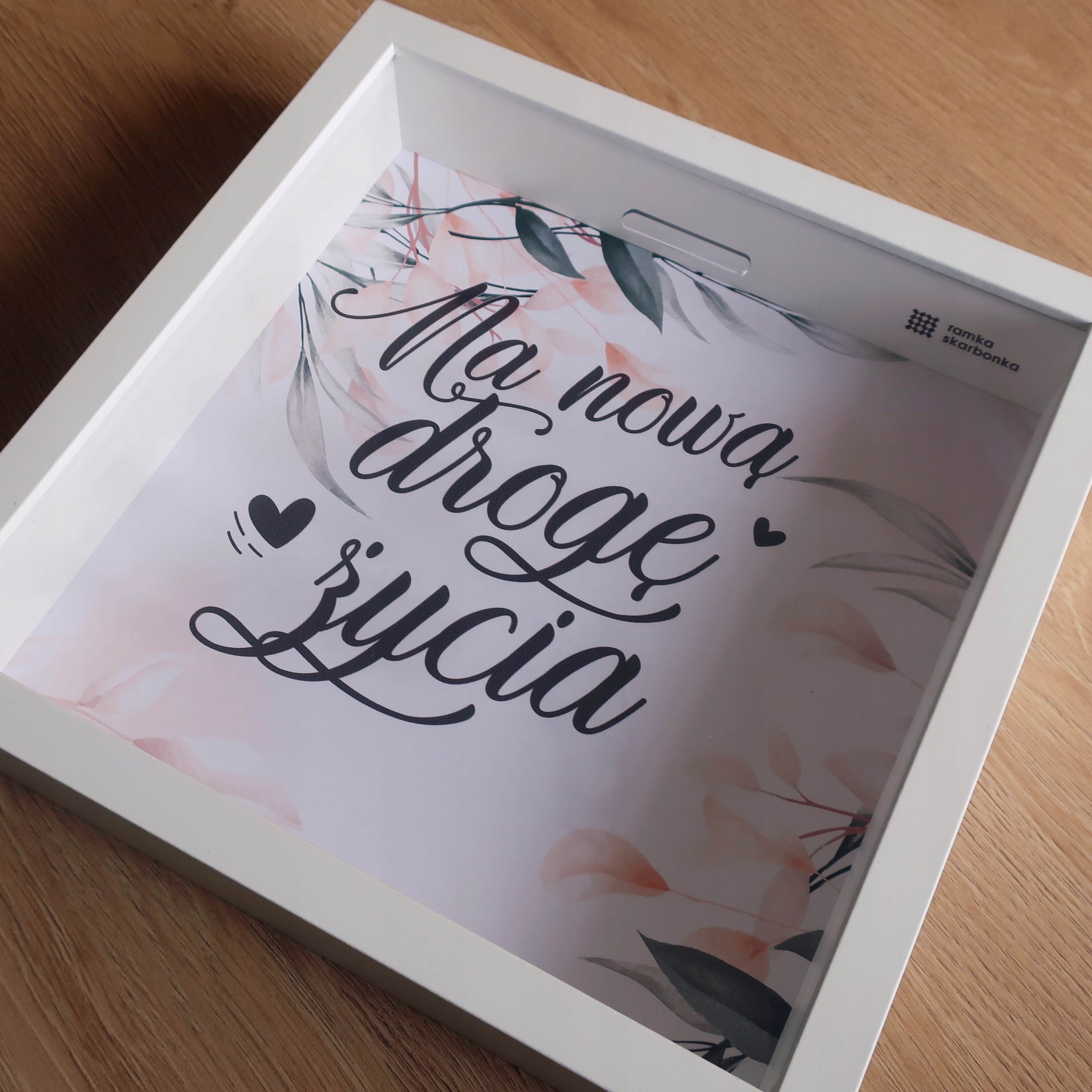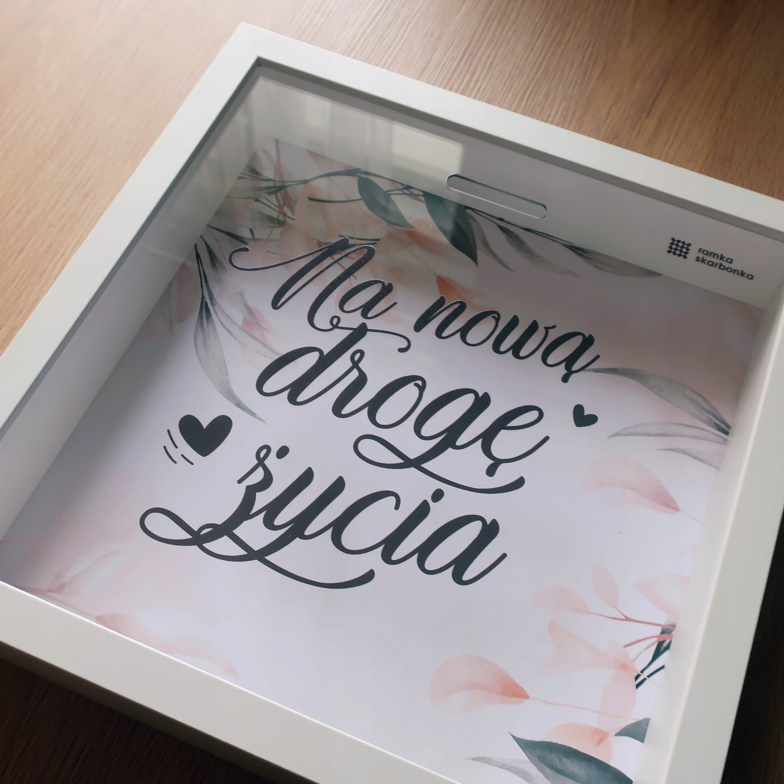 Ramka Skarbonka „Na nową drogę życia” – idealny prezent ślubny dla bliskich. Nadrukowane na przezroczystej pleksie elegancki czarny napis i serca współgrają ze sobą. W tle znajduje się natomiast kwiatowe tło, tworząc harmonijną, ślubną kompozycję.