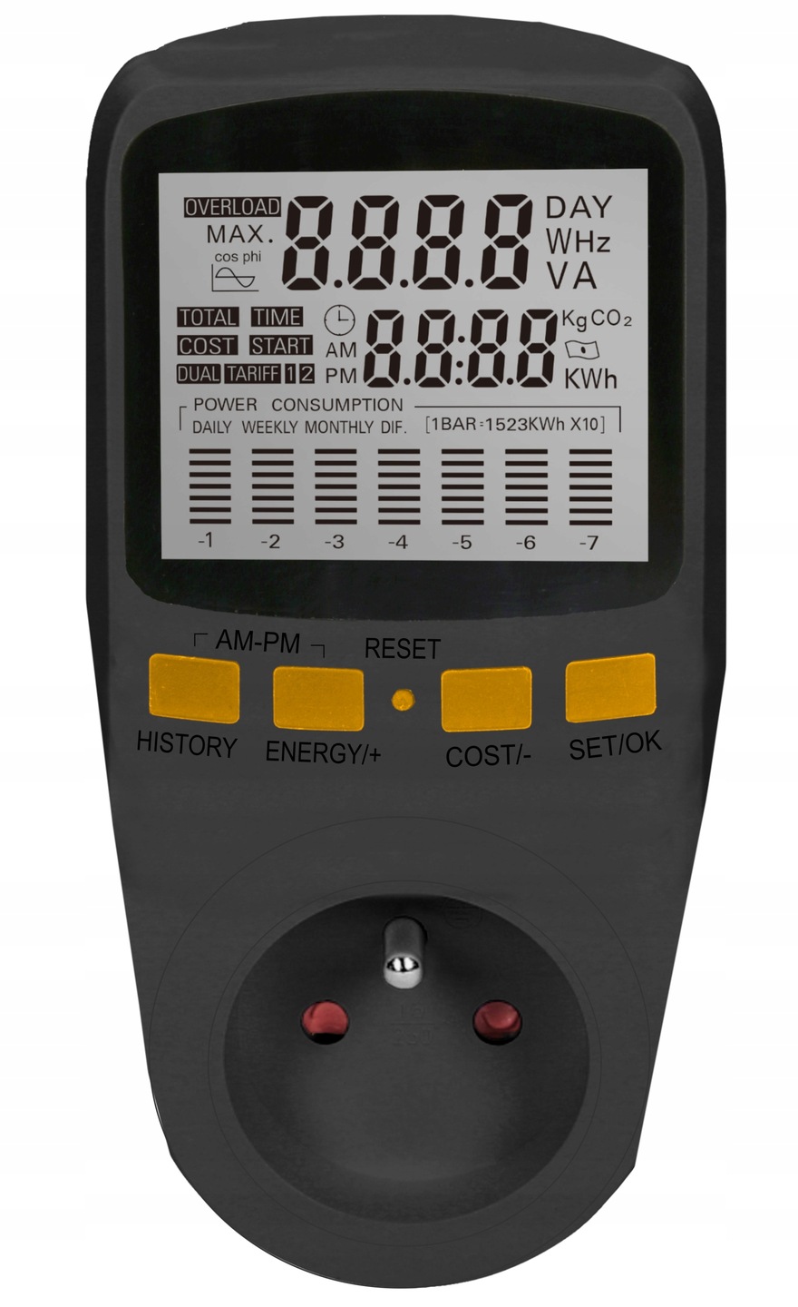 Precyzyjne pomiary zapewnią większą kontrolę kosztów, pomagając skutecznie obniżyć rachunki. Na podświetlanym ekranie urządzenia sprawdzisz m.in. informacje o zużyciu prądu, napięciu i mocy podłączonego urządzenia. Jeden rzut oka na przejrzysty wykres wystarczy, aby sprawdzić, jak zmieniało się zużycie w energii w ciągu ostatnich dni, tygodni lub miesięcy. Watomierz umożliwi liczenie kosztów na podstawie 2 różnych taryf. Pozwoli też obserwować, jak oszczędności wpływają na redukcję emisji CO2 do środowiska.