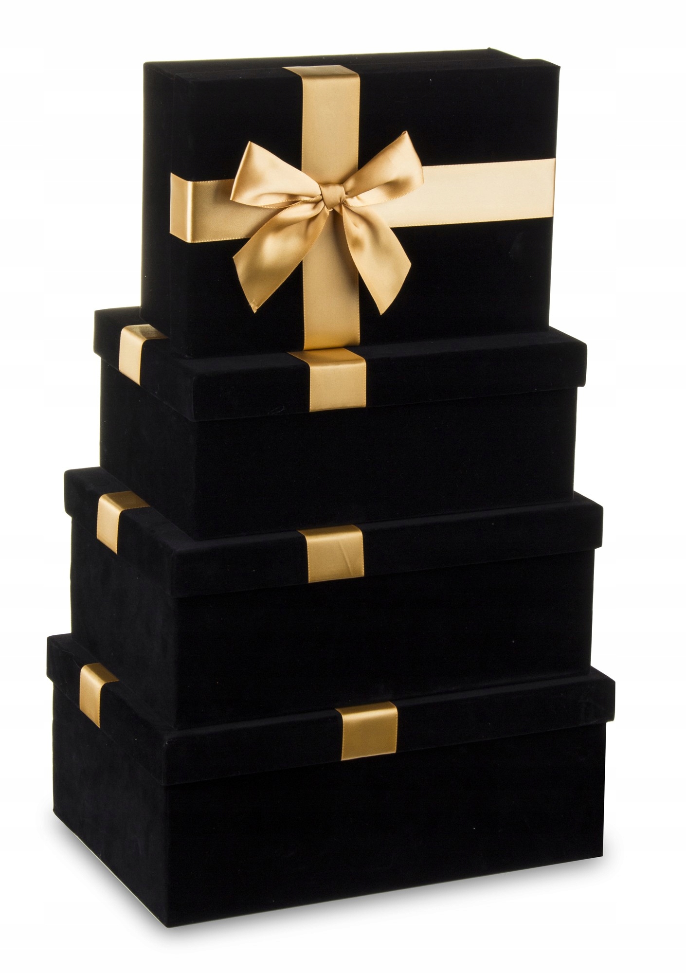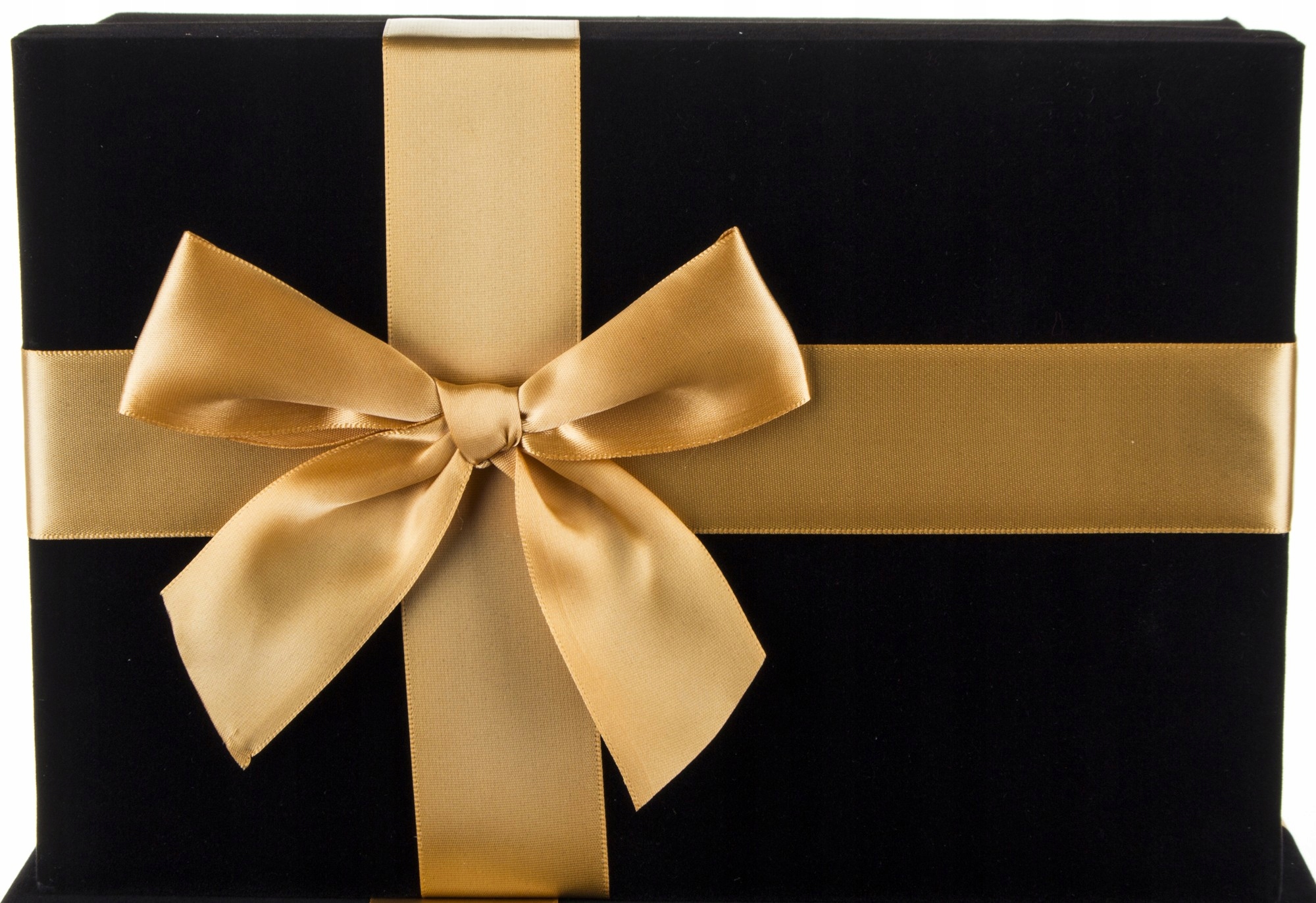 Eleganckie pudełko prezentowe pokryte czarnym welurem, ozdobione złotą kokardą .