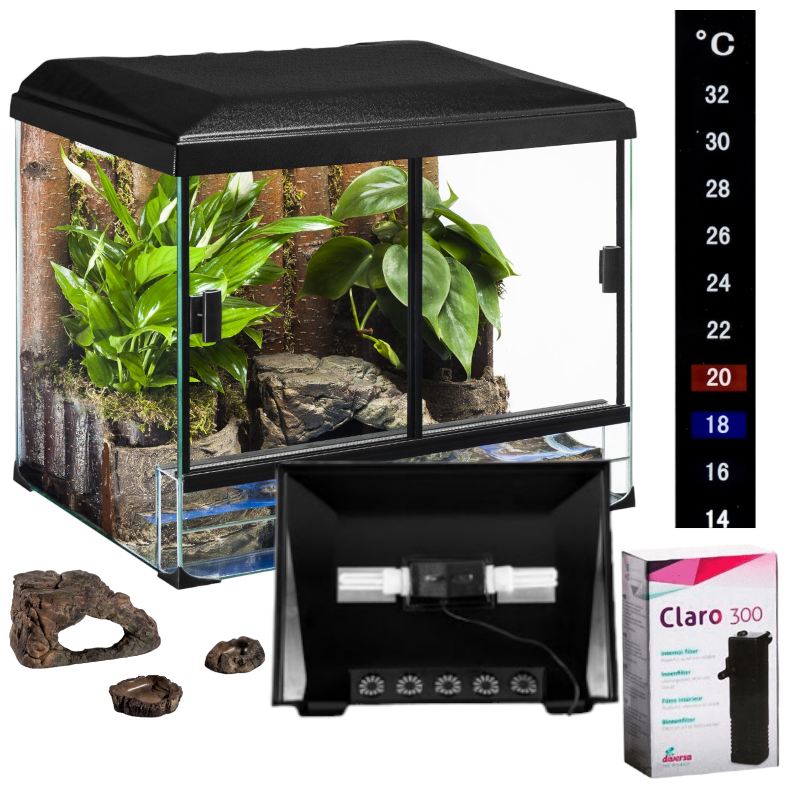 Wyposażenie widoczne w terrarium na zdjęciu głównym jest wyłącznie częścią poglądowej aranżacji, akcesoria dołączone do zestawu są wymienione w ofercie.