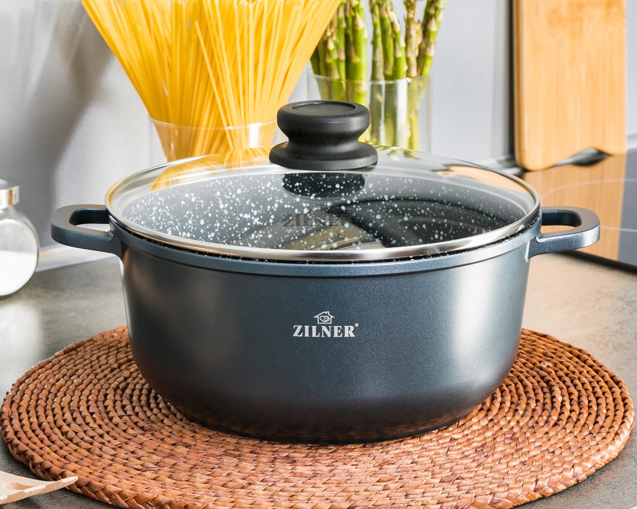 Набор от известной компании Zilner позволяет с комфортом готовить, тушить и запекать блюда. Роскошная форма посуды, входящая в комплект, прекрасно вписывается в любой кухонный интерьер, это придает ему оригинальный характер и позволяет невероятно комфортное, безопасное и здоровое приготовление ежедневное питание.