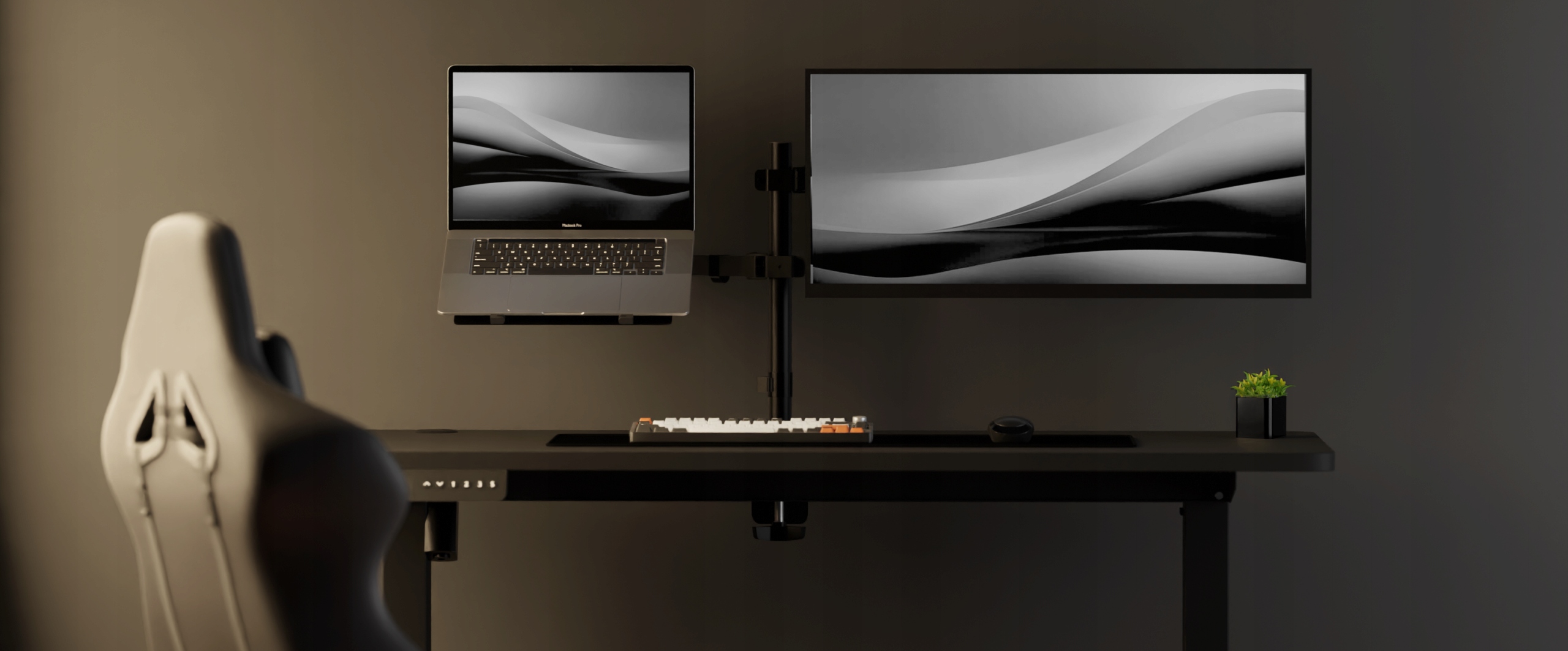 Biurko Control Series bez żadnego problemu współpracować będzie z dwoma monitorami na uchwytach mocowanych do blatu i całą resztą akcesoriów. Dodatkowo, klipsy do prowadzenia kabli oraz przepust w blacie pomagają utrzymać porządek i ukryć niepotrzebny bałagan, dbając jednocześnie o estetyczny wygląd stanowiska pracy.