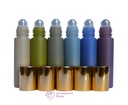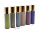Butelka rollon wykonana z grubego, matowego kolorowego szkła wykończona złotą nakrętką.