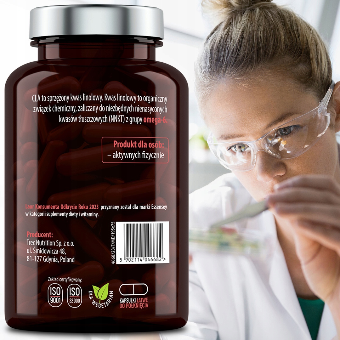 Suplement diety ESSENSEY CLA zawiera 958 mg sprzężonego kwasu linolowego w porcji produktu zalecanej do spożycia w ciągu dnia.