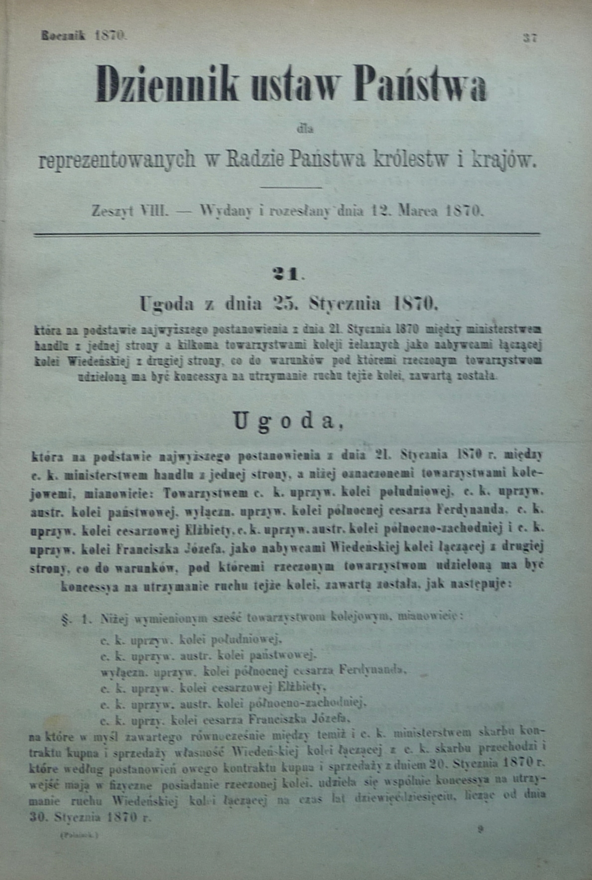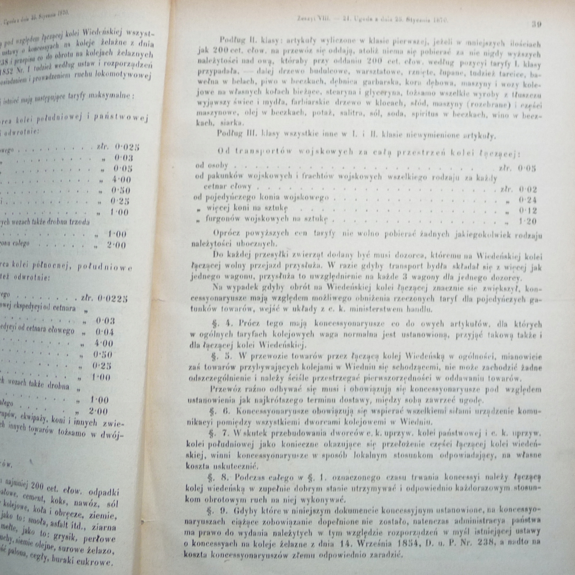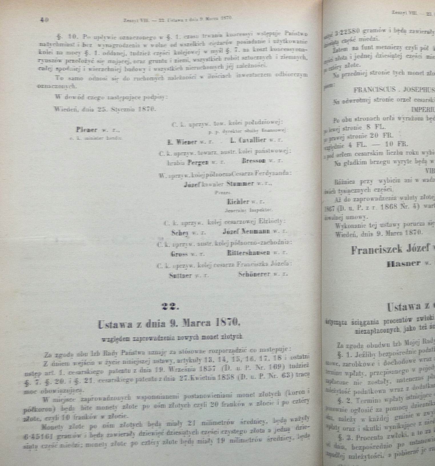 W OFERCIE- Dziennik Rządu Krajowego dla Okręgu Administracyjnego Krakowskiego Rok 1870 , Zeszyt VIII, wydany i rozesłany dnia 12 marca 1870. 6 stron, broszura, format 19x26 cm, stan dobry [ papier nieco pożółkły, trochę bardziej w brzegach kart ][ w treści : Ugoda w/s eksploatacji kolei na terenie c. k. Austrii, Ustawa względem zaprowadzenia nowych monet złotych ( zastąpienie monet 1 i ½ korony monetami frankowymi/ florenami ) w tekście opis nowych monet, Ustawa dotycząca ściągania procentów od zwłoki od podatków niezapłaconych ] [ NUMIZMATYKA ] [ KOLEJNICTWO ][ C K USTAWODAWSTWO ]28C