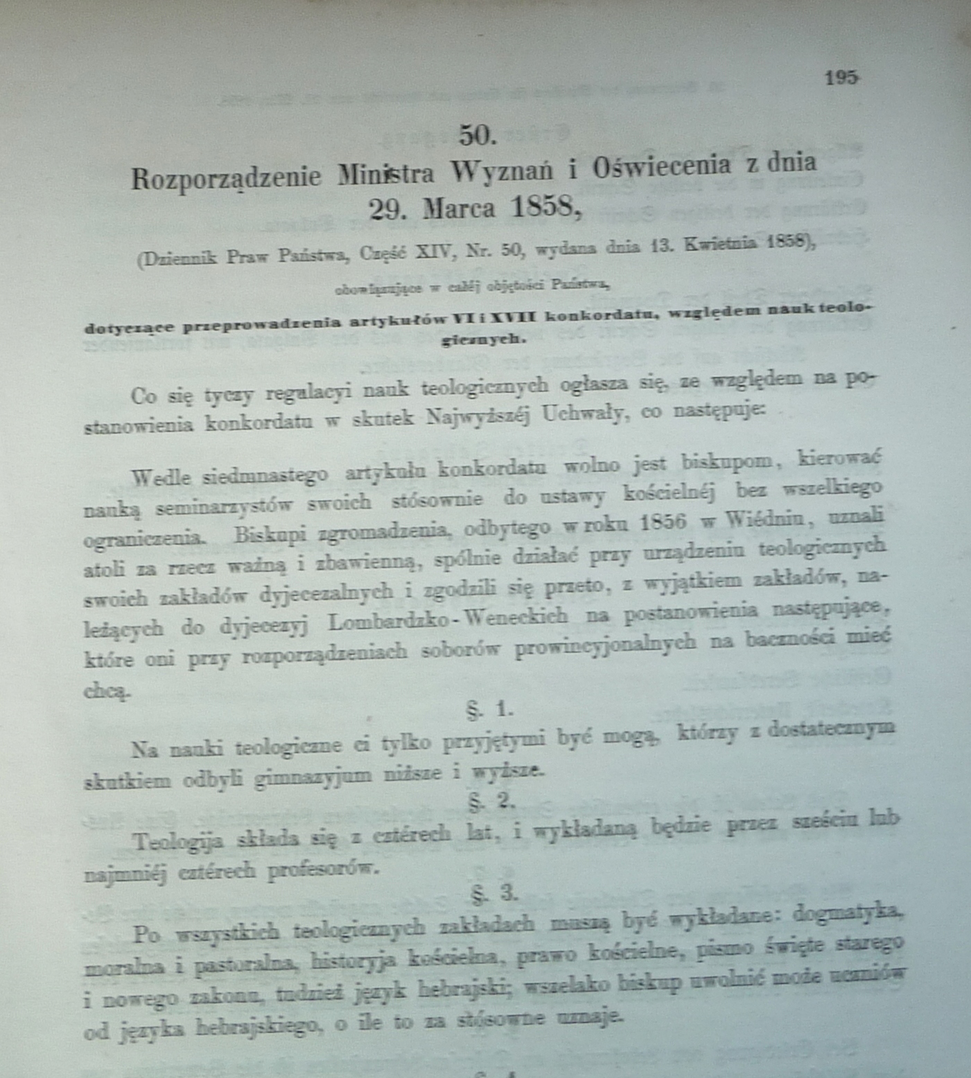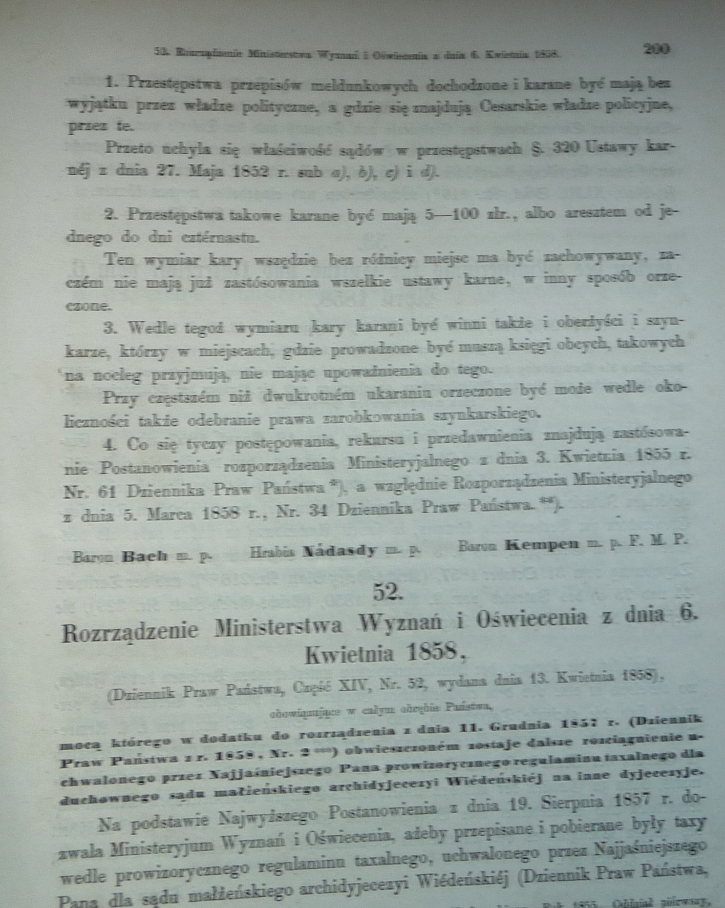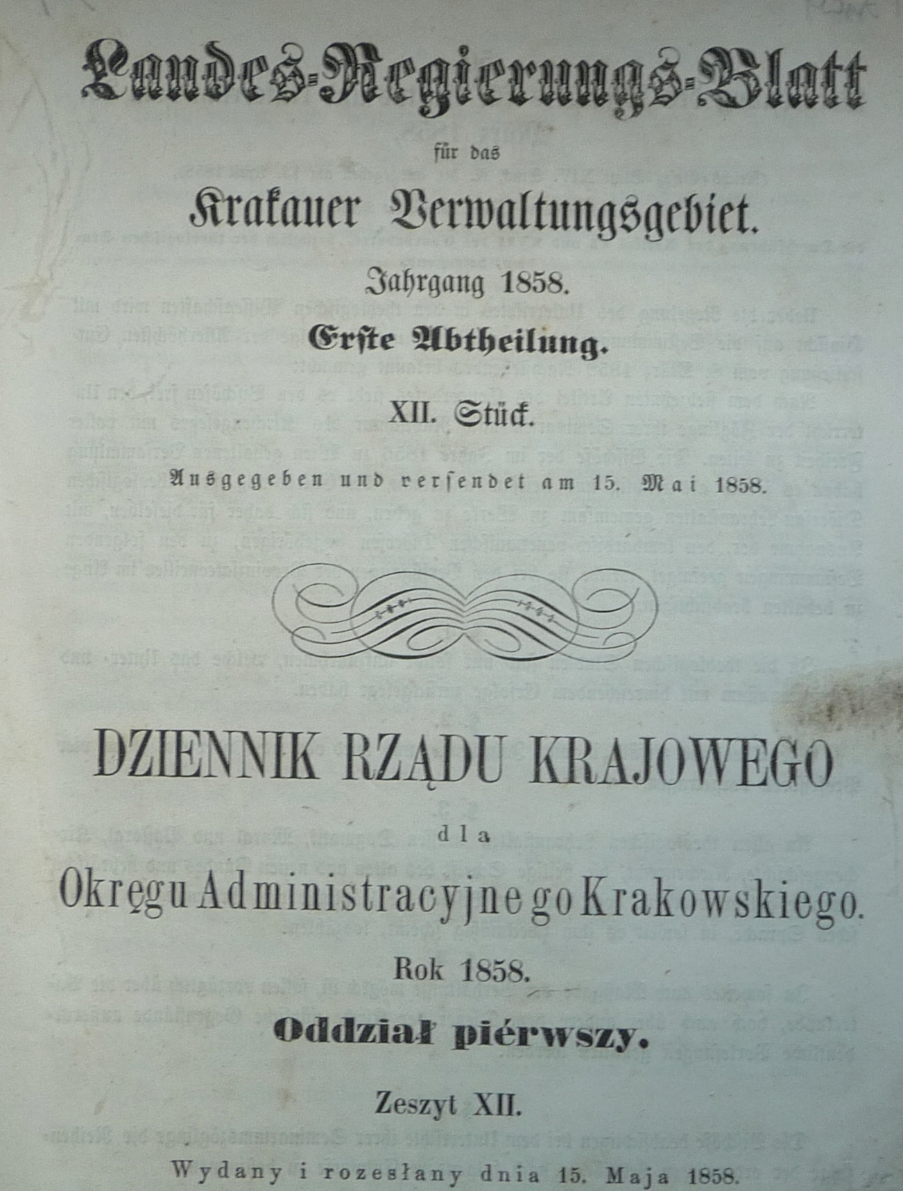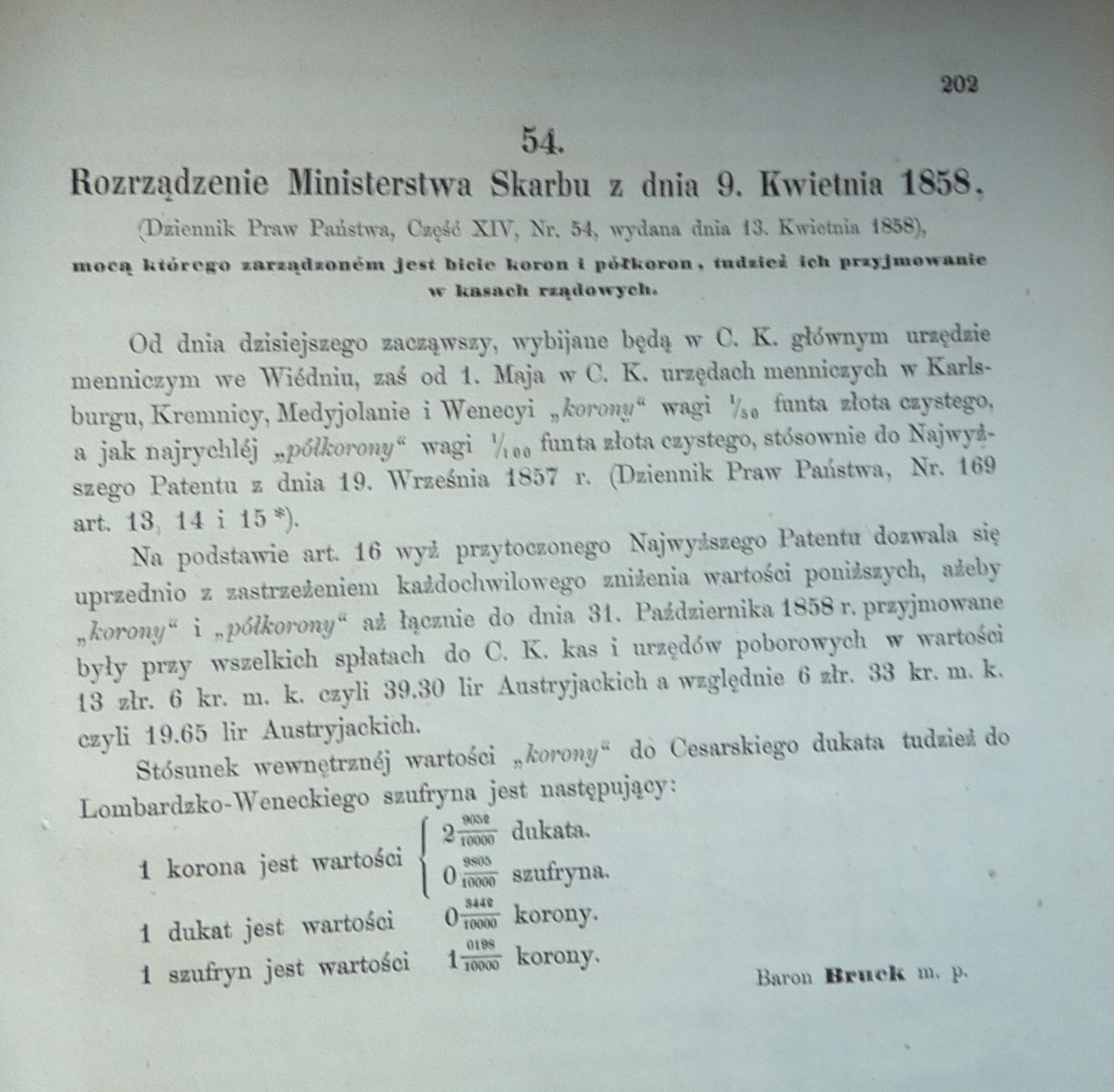 W OFERCIE- Dziennik Rządu Krajowego dla Okręgu Administracyjnego Krakowskiego Rok 1858 Oddział pierwszy, Zeszyt XII, wydany i rozesłany dnia 15 maja 1858. 17 stron (tekst równoległy w języku niemieckim i polskim), broszura, format 23x18 cm, stan dobry [ niewielkie uzupełnienia w dolnym rogu ][ w treści: pod numerem 50. Rozporządzenie dotyczące przeprowadzenia artykułów VI i XVII konkordatu, względem nauk teologicznych ( 5x2 strony), Rozporządzenie mocą którego obwieszczonem zostaje dalsze rozciągnienie uchwalonego prowizorycznego regulaminu taxalnego dla duchownego sądu małżeńskiego archidyjecezyi Wiedeńskiej na inne dyjecezyje ( 2x1 strona), Rozporządzenie dotyczące stosowania w/w regulaminu, W punkcie 54. „Rozporządzenie Ministerstwa Skarbu z adnia 9. Kwietnia 1858, mocą którego zarządzonem jest bicie koron i półkoron, tudzież ich przyjmowanie w kasach rządowych”. Monety wybijane będą w mennicach w Karlsburgu, Kremnicy, Medyjolanie i Wenecyi, , „korony” wagi 1/50 funta złota czystego, a jak najrychlej „półkorony” wagi 1/100 funta złota czystego. Poniżej podano przeliczniki - do dukata i szufryna ( 2x1 strona tekstu) ][ NUMIZMATYKA ] [ C K USTAWODAWSTWO ][ MONETY ] [ C K AUSTRIA ]317C