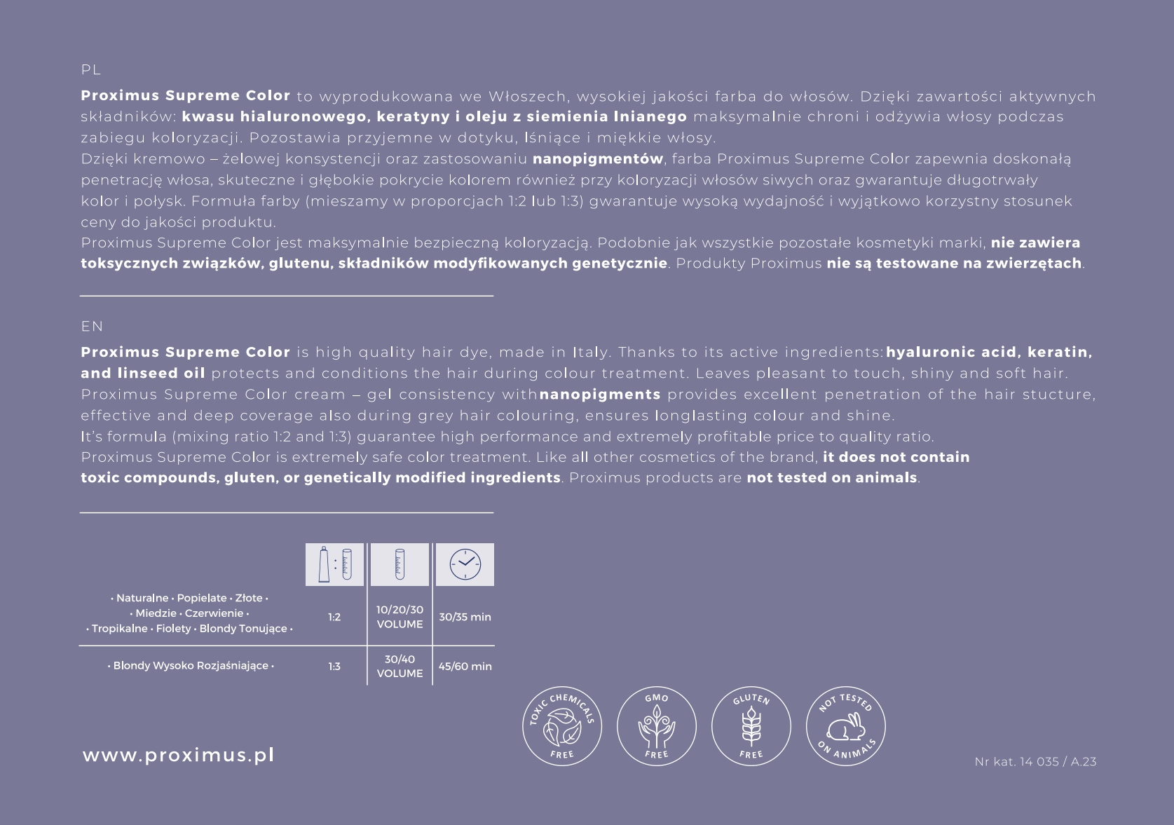 Farba do włosów Proximus Supreme Color Nanotechnology stanowi przełom w ofercie marki. Gwarantuje ona nową jakość nanokoloryzacji za wyjątkowo korzystną cenę. Formuła farby została udoskonolona z myślą o włosach coraz częściej narażonych na silne szkodliwe działanie czynników zewnętrznych i cywilizacyjnych.