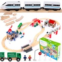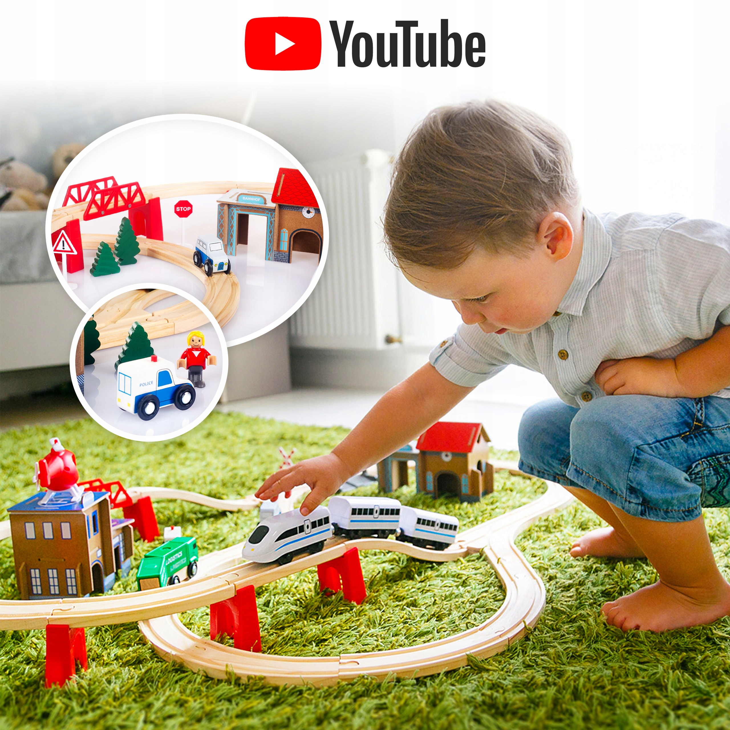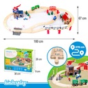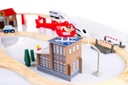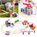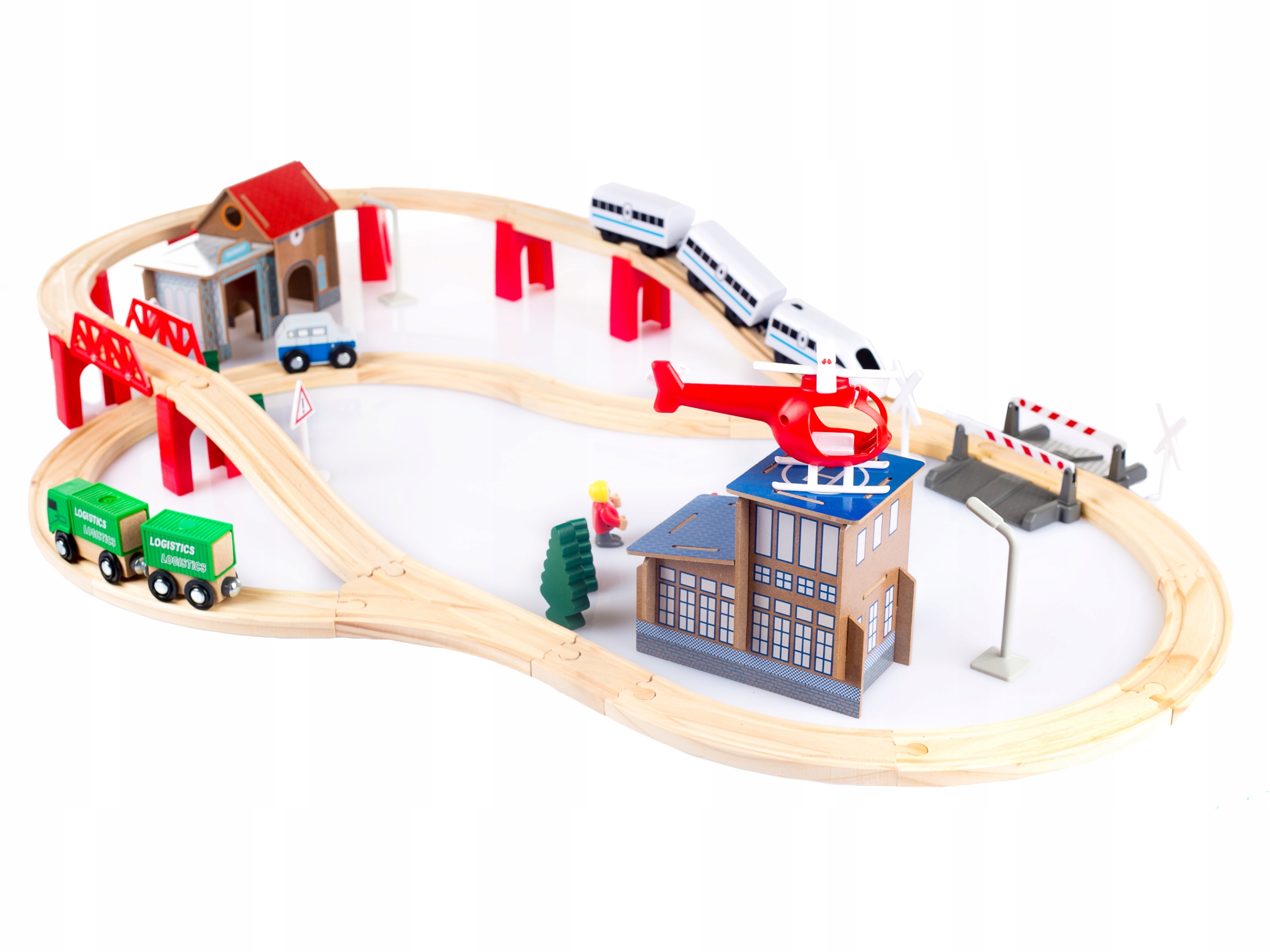 Drewniana kolej z posterunkiem policji to zestaw 80 elementów. Całość składa się z wielu ciekawych elementów w tym np. pojazdów, znaków drogowych, drzew, szlaban i mostek. Duża liczba akcesoriów sprawia, że dzieci będą się bawić zabawką bez końca, przy okazji rozwijając również swoją zręczność, koordynację wzrokowo – ruchową, kreatywność oraz wyobraźnię