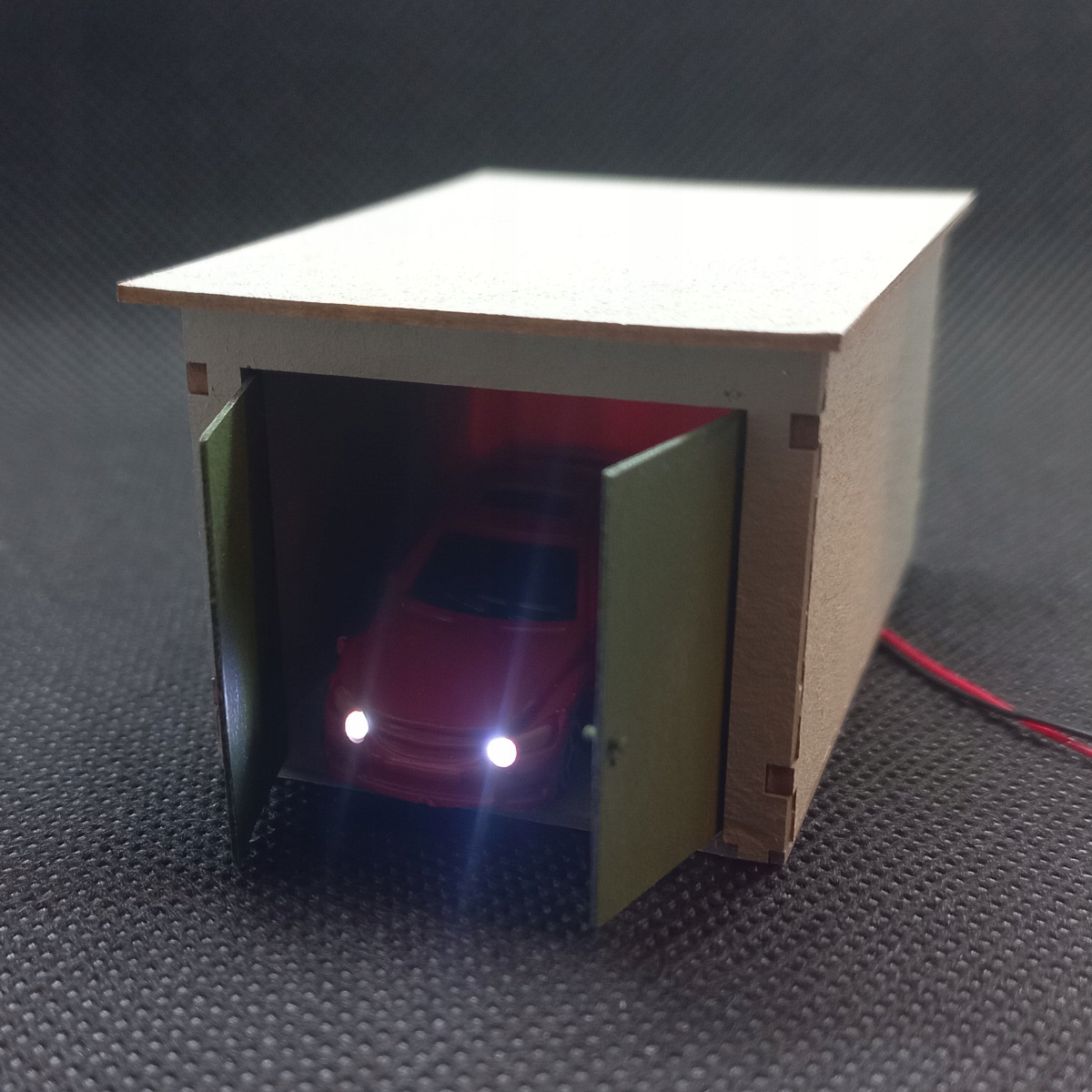 Garaż w skali H0 wycięty laserem z tektury 1,5mm, 1mm oraz z 0.5mm. Zestaw wycięty, zawiera elementy do złożenia garażu, dodatkowo w zestawie zawarty jest czarny arkusz imitujący papę do przyklejenia na dach.