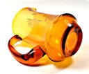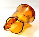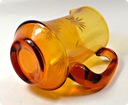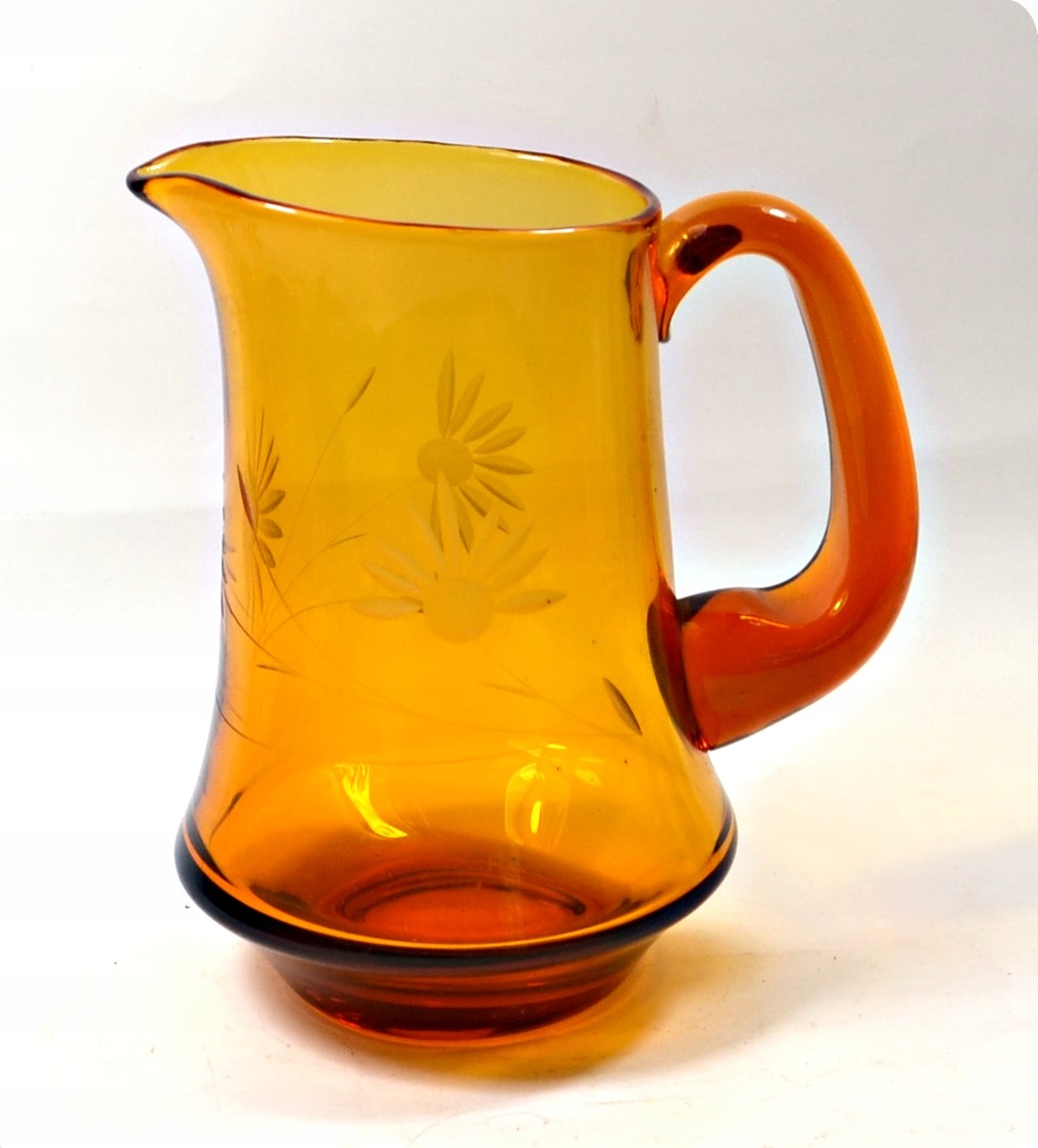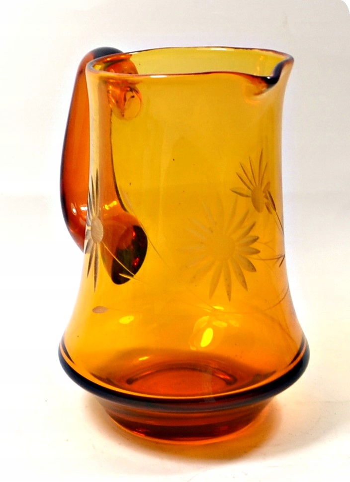 Prześliczny, stary dzbanek. Szkło grubościenne. Szkło barwione w masie na kolor miodowy-bursztynowy. Forma dość prosta, osadzona na zaznaczonej podstawie i z wyraźnie zarysowanym wlewem. Ozdobny uchwyt oraz piękny, ręczny szlif.