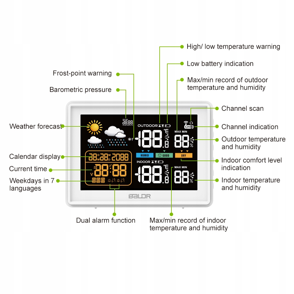 Wyświetlacz z czarnym podkładam ukazuje minimalistyczny i nowoczesny design bezprzewodowej domowej stacji pogodowej Baldr B359-PR, dzięki czemu pasuje do każdego wnętrza. Urządzenie wyświetla dane pogodowe, godzinę, kalendarz, ma również możliwość ustawienia alarmu. Temperatura powietrza może być wyświetlana w °C lub °F.