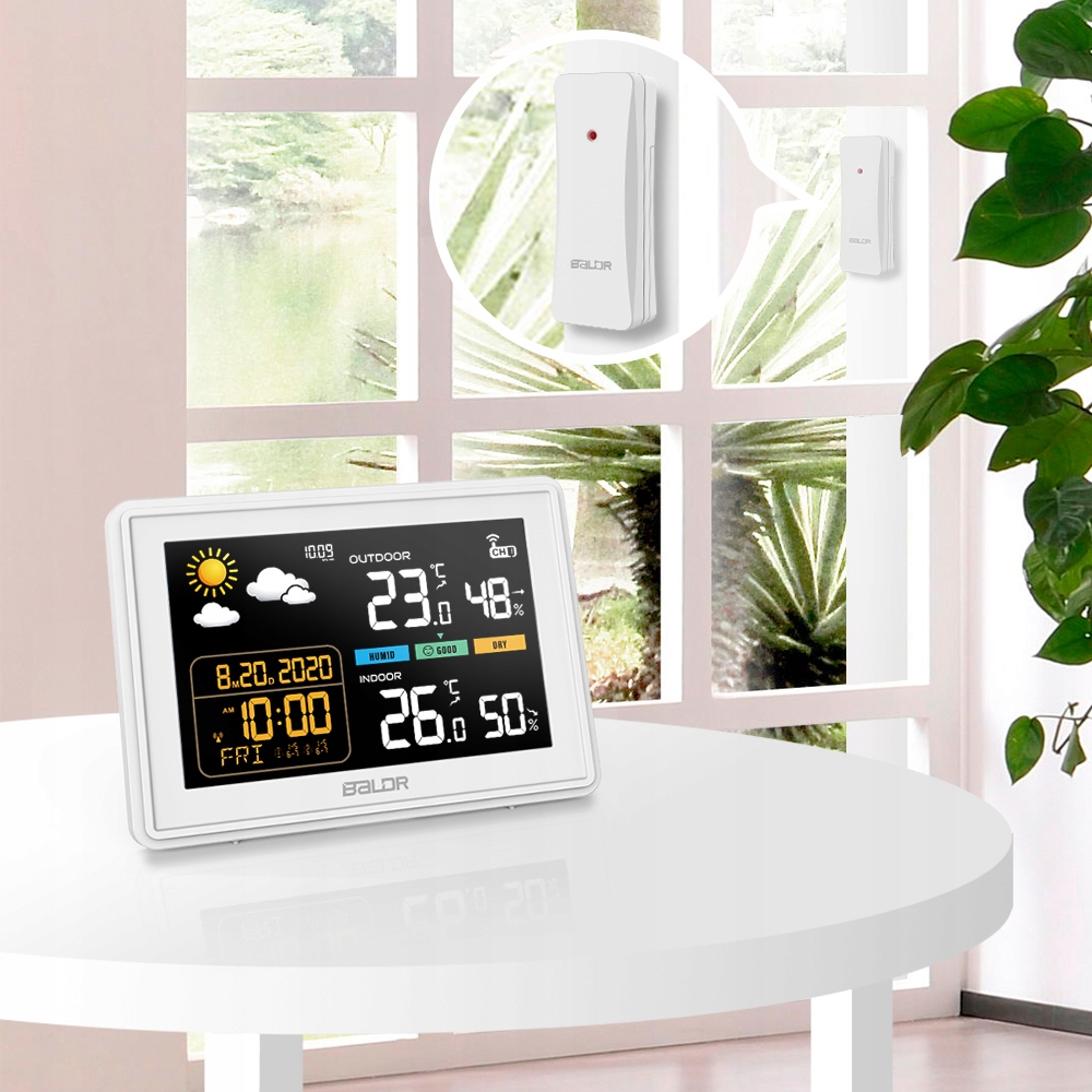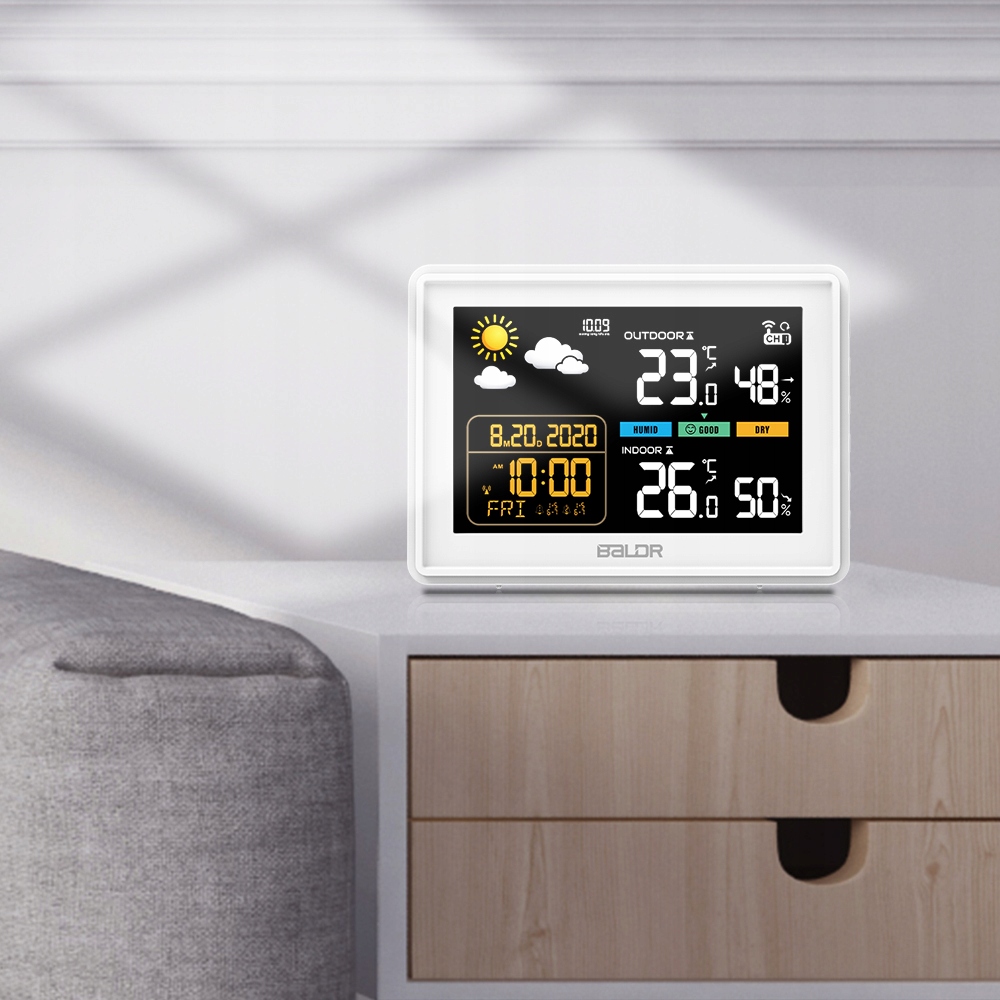 Bezprzewodowa stacja pogodowa Baldr B359-PR z funkcja alertu pogodowego: mierzy temperaturę wewnętrzną i zewnętrzną oraz przewiduje lokalną prognozę pogody, co czyni go idealnym wyborem do uzyskiwania dokładnych pomiarów dostępnych za jednym spojrzeniem na dużym czytelnym wyświetlaczu.