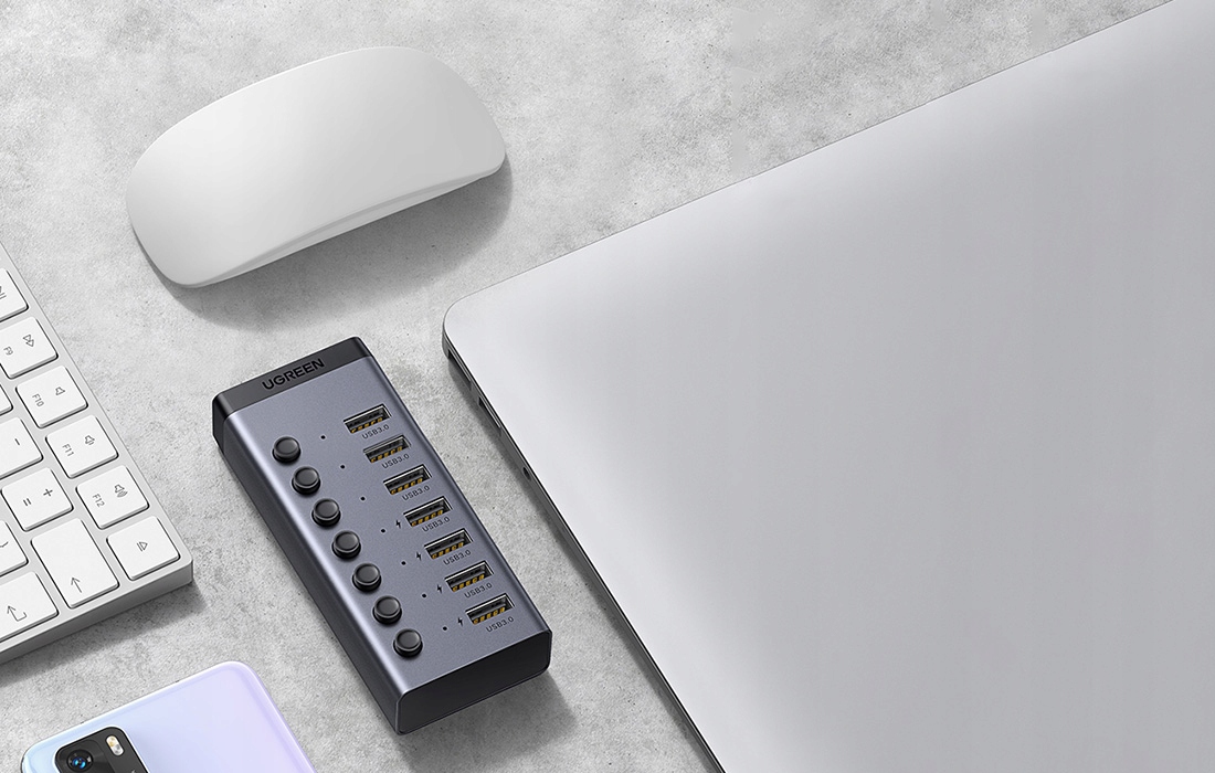 Chcesz zwiększyć możliwości swojego komputera? Hub UGREEN zapewnia 7 portów USB 3.0, z czego 4 umożliwiają szybkie ładowanie BC 1.2. Za jego pomocą możesz też przesyłać pliki z prędkością do 5 Gbps. W skład zestawu wchodzi też zasilacz z kablem USB-C.