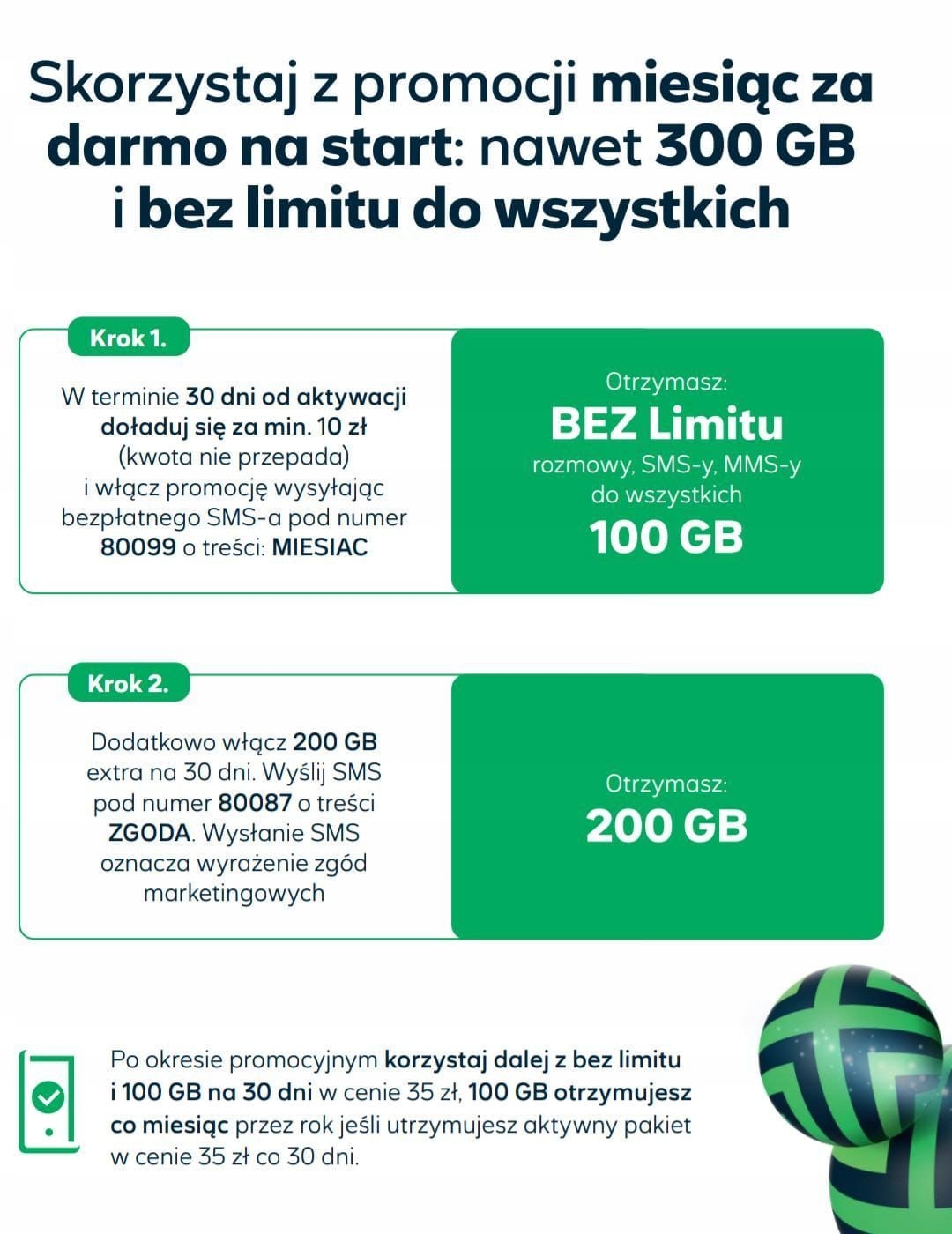 Do 30 dni od aktywacji doładuj się za min. 20 zł (kwota nie przepada) i wyślij SMS pod numer 80099 o treści: MIESIAC