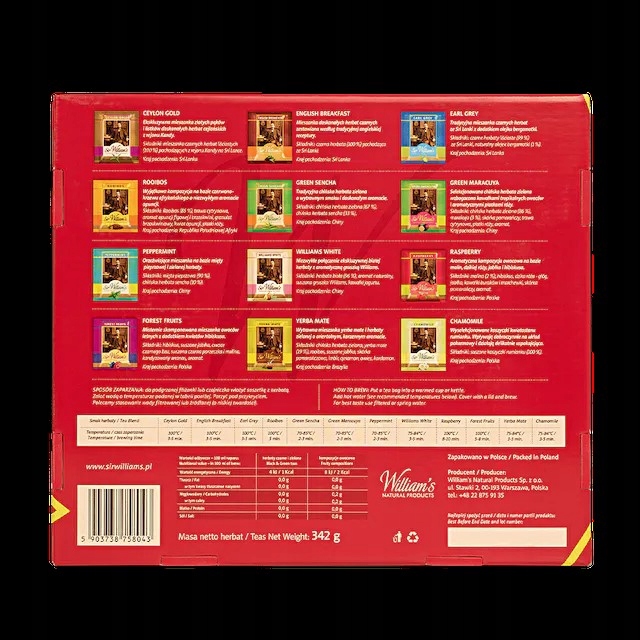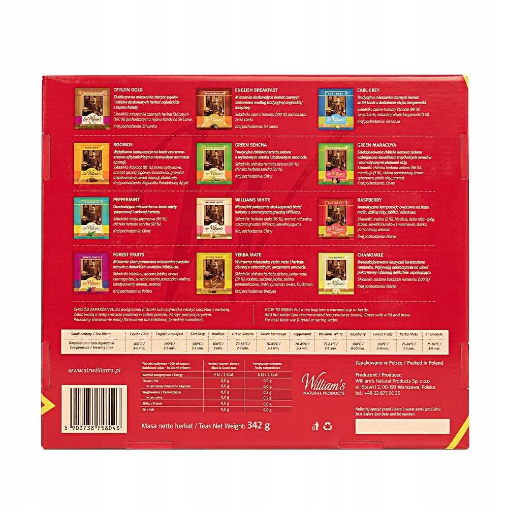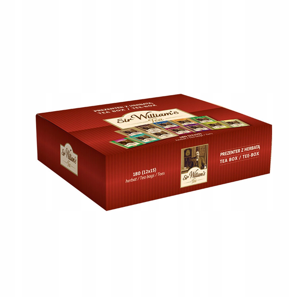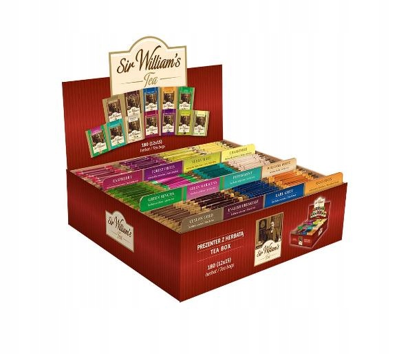 Drewniana skrzynka do prezentacji herbaty Sir William's w restauracji, jak i w domu. W kolekcji jest dwanaście różnych smaków herbaty po 15 saszetek. Wykonane z tektury pudełko pozwala na świetną prezentację i organizację herbaty. Może być również praktycznym prezentem, wyposażeniem biura lub kuchni domowej. Herbaty w zestawie: Ceylon Gold, English Breakfast, Earl Grey, Green Sencha, Green Maracuja, Peppermint, Williams White, Yerba Mate, Raspberry, Forest Fruits, Rooibos, Chamomile.