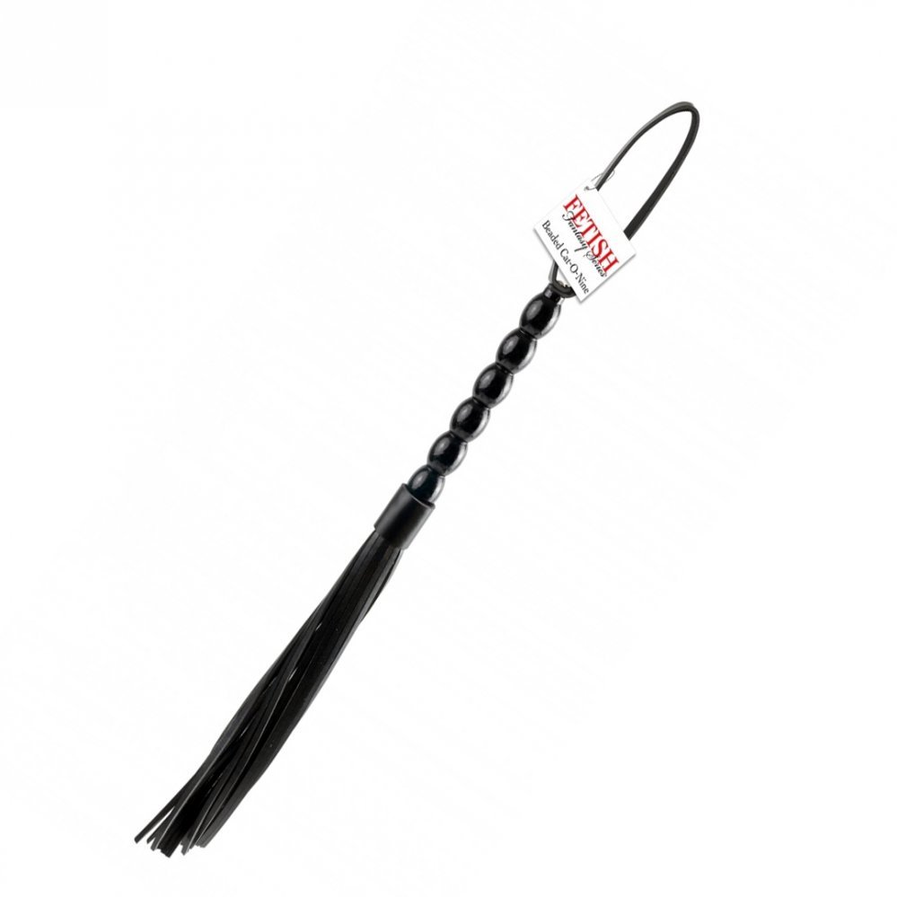 Czarny bicz od Fetish Fantasy o nazwie Czarny kot jest wyposażony w drewniany uchwyt w kształcie połączonych koralików, który zawiera praktyczny pasek na rękę. Pasma bicza wykonane są z łatwo zmywalnego winylu.