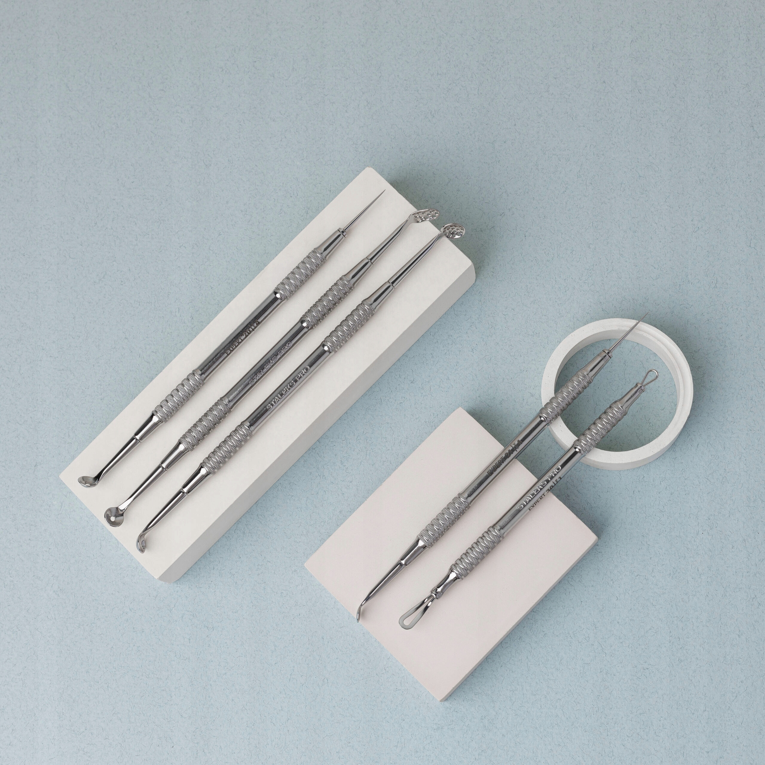 Wszystkie mają wygodny cylindryczny uchwyt ze specjalnymi wyżłobieniami, które zapobiegają ślizganiu się narzędzia z dłoni podczas pracy. Narzędzia te nie uszkadzają płytki paznokcia, ponieważ są doskonale ostre, a więc stylista nie musi mocno naciskać na paznokieć, aby skutecznie odsunąć naskórek.