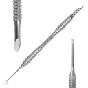 aby oczyścić płytkę paznokcia ze skrzydlika, użyj części roboczej w postaci pierścienia. Umieść pierścień szpatułki na skrzydliku i delikatnie zeskrob nadmiar skóry.