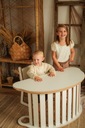 Blat nakładany na bujak tworzy stolik dla dziecka. Blat wpuszcza się w uchwyty bujaka odwróconego bokiem.
