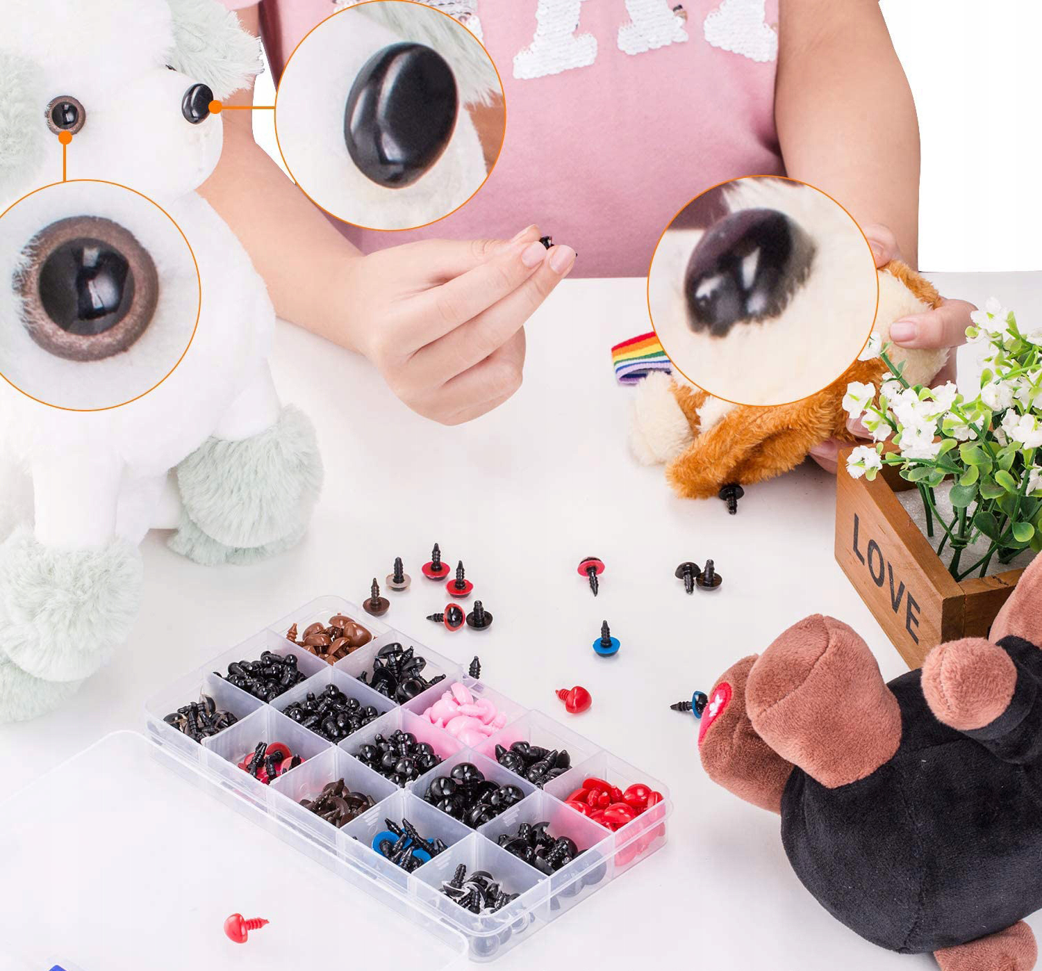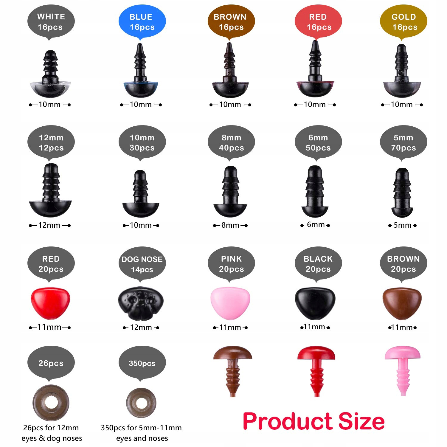 Zestaw bezpiecznych oczu i nosów znajduje szerokie zastosowanie w ręcznie robionych lalkach, projektach i rzemiośle. Jest idealny do stosowania przy tworzeniu wszelkiego rodzaju wypchanych stworzeń, takich jak pluszowe lalki, misie, oraz materiały ATR (arts and crafts) i wiele innych.