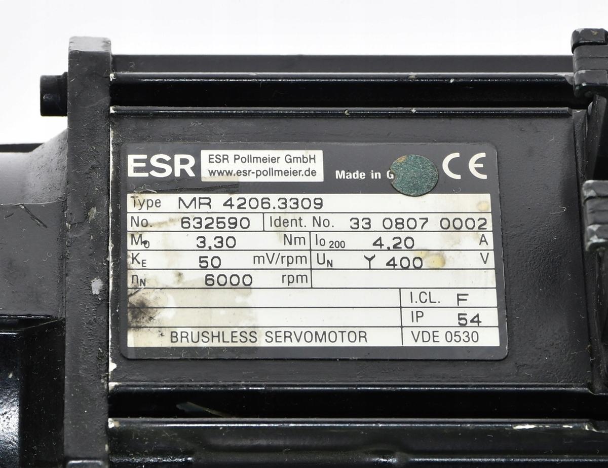 Używany, całkowicie sprawny element o symbolu: MR 4206.3309, produkt firmy ESR Pollmeier. Kod producenta: 33 0807 0002. Serwomotor z kanałami przelotowymi w wale. Pochodzi z demontażu całkowicie sprawnych maszyn przemysłowych.