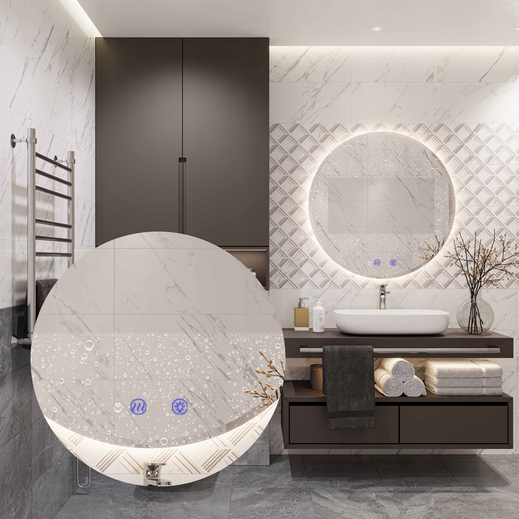 ☝️ Dzięki wbudowanej maty grzewczej, lustro skutecznie zapobiega zaparowaniu powierzchni, umożliwiając utrzymanie idealnej widoczności. Funkcję podgrzewania można aktywować za pomocą podświetlonego przycisku dotykowego.