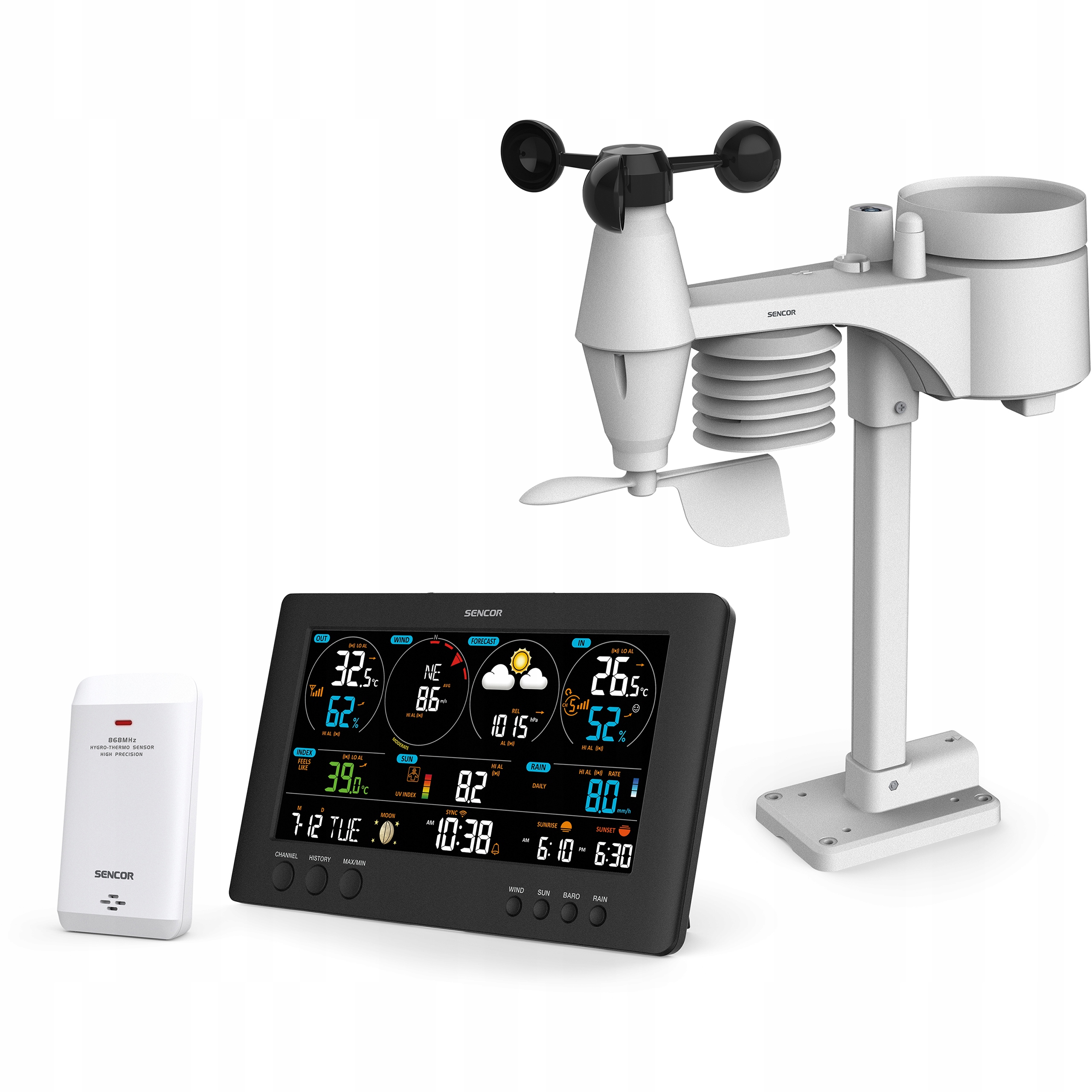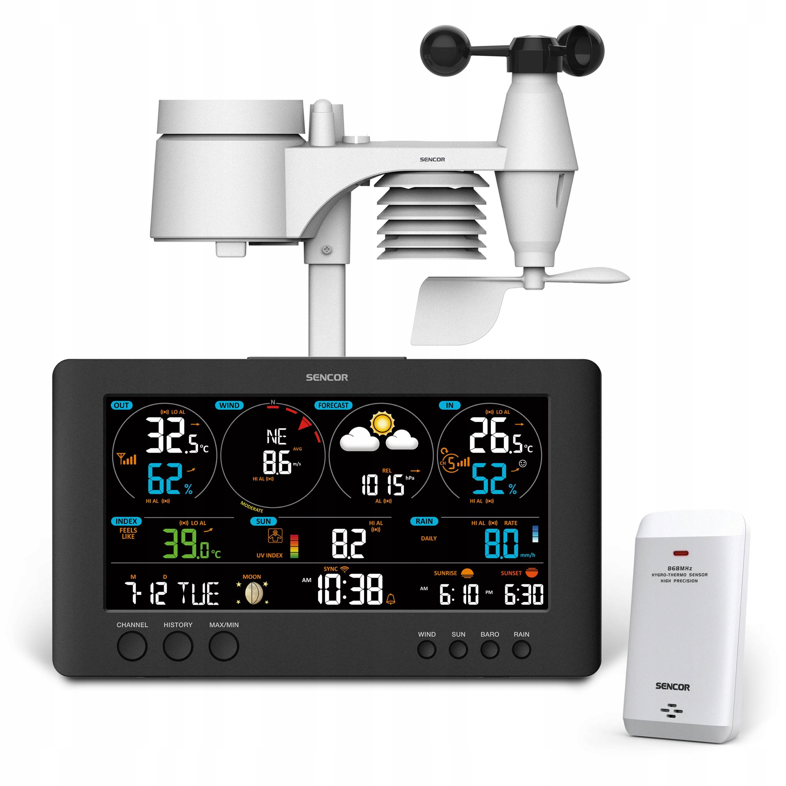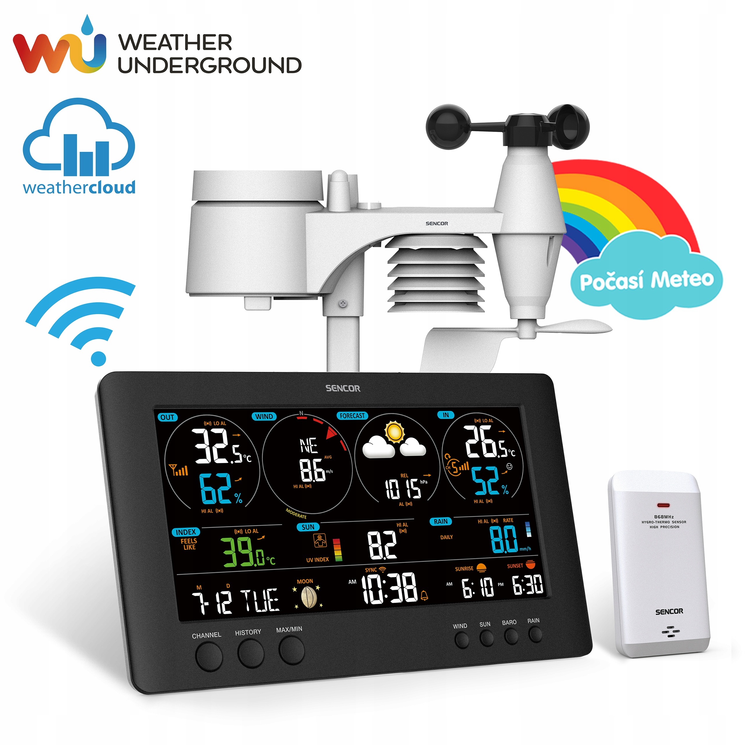 Profesjonalna stacja pogodowa SWS 12500 WIFI obsługuje globalne publiczne platformy meteorologiczne ,,Weathercloud’’ oraz ,,Weather Underground’’. Współpracuje z inteligentnymi urządzeniami domowymi, daje dostęp do danych online oraz historii. Stacja pogody mierzy temperaturę wewnętrzną i zewnętrzną z podaniem wskaźnika rozwoju. Wilgotność wewnętrzna i zewnętrzna uwzględniana jest z tzw. wskaźnikiem komfortu. Dodatkową zaletą jest wyświetlanie poziomu promieniowania UV.