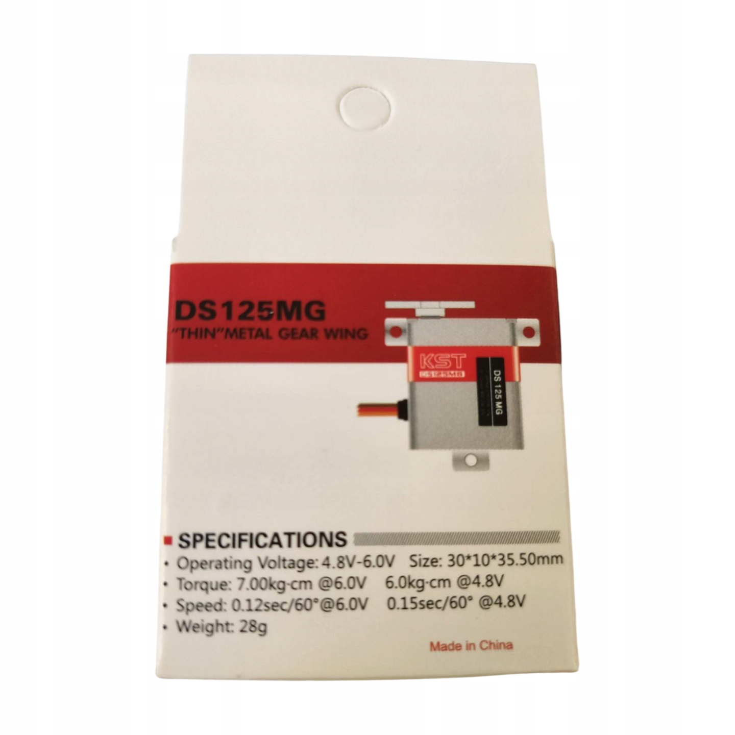 Serwomechanizm KST DS125MG to precyzyjne urządzenie o wymiarach 30x10x35,5mm. Działa przy częstotliwości 333Hz i waży 28g.