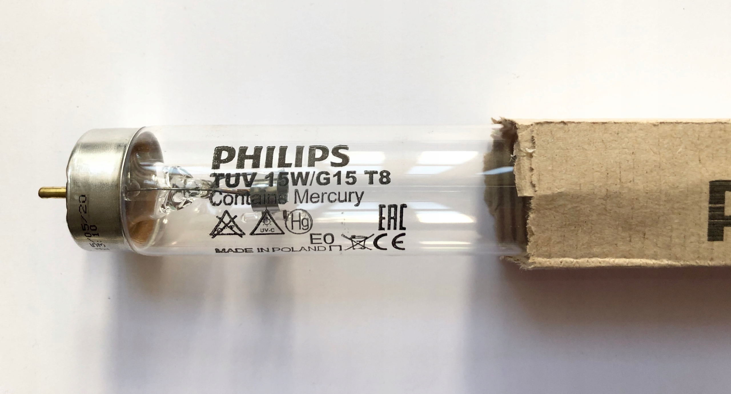 Promiennik Philips TUV T8 G15 o mocy 15W, o wyglądzie świetlówki liniowej T8 o średnicy 26 mm, ze standardowym trzonkiem dwustronnym G13 (w przypadku świetlówek UV-C producenci oznaczają tą konkretną moc świetlówki jako G15).