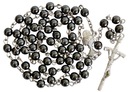 Różaniec wykonany jest z NATURALNEGO KAMIENIA HEMATYT w kolorze grafitowym.