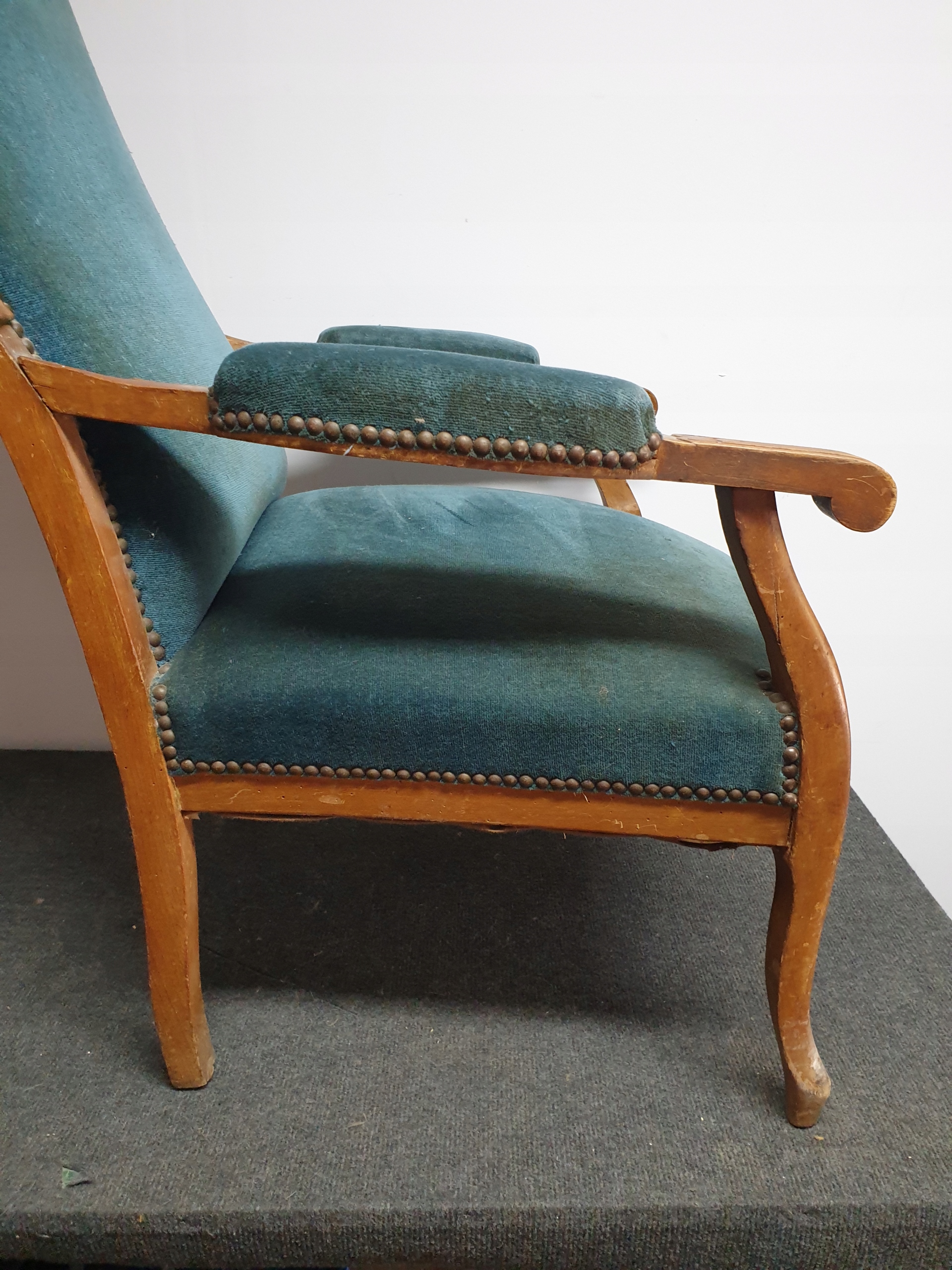 obity aksamitem niebieskim aksamitem /welurem , pochodzi z Francji , zachowany w bardzo dobrym stanie , stabilny szeroki, na zdjęciach widoczne zużycie czasem