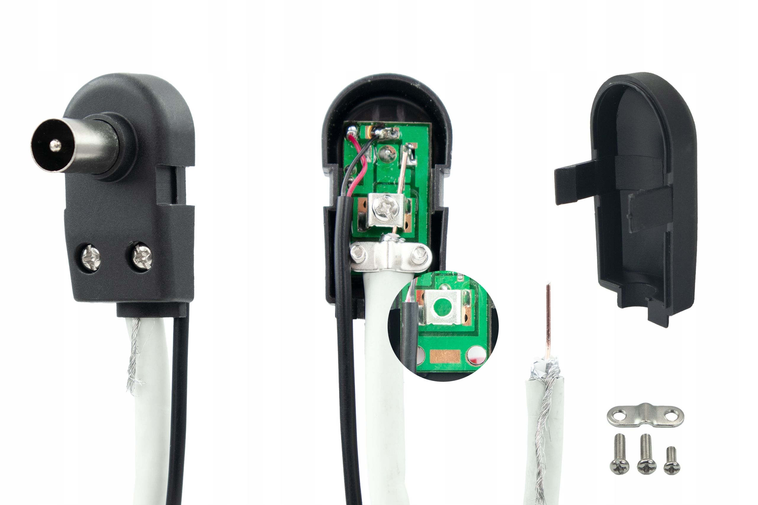 Antena DVB-T2 dostarczana jest wraz z końcówką typu F gotową do zamontowania na przewodzie koncentrycznym np. RG-6 (brak w zestawie). Antena wyposażona jest w zasilacz sieciowy 230V AC który zapewnia prawidłowe funkcjonowanie wzmacniacza wbudowanego w antenie. Przewód koncentryczny należy prawidłowo zamontować wewnątrz wtyku zasilacza antenowego do prawidłowego działania anteny. Następnie należy podłączyć zasilacz do prądu a wtyczkę antenową do gniazda RF-IN (Antenna IN) w odbiorniku telewizyjnym lub do zewnętrznego tunera DVB-T / DVB-T2.