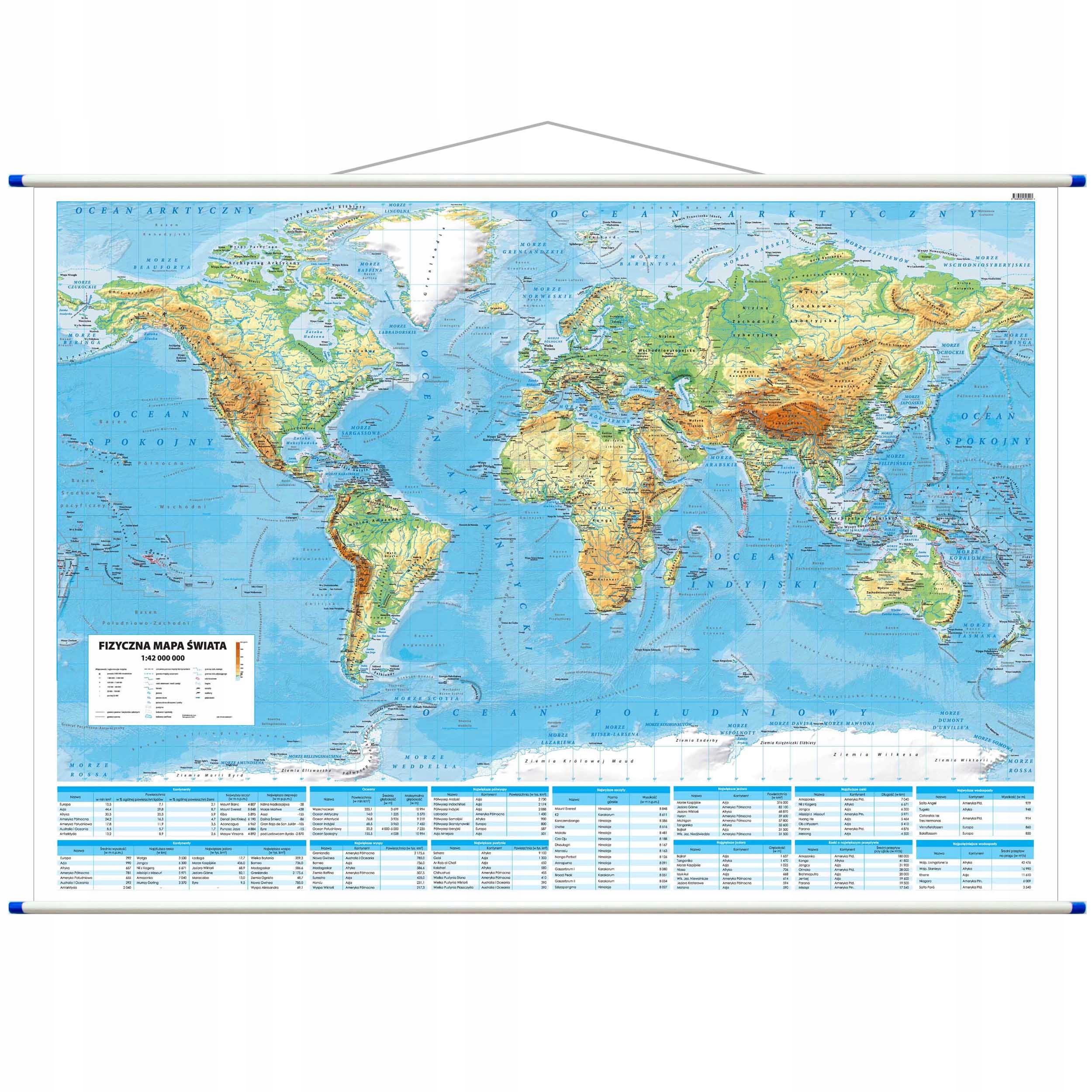 ➡️ Dodatkowo w dolnej części mapy umieszczono tabele z informacjami o: kontynentach, oceanach, największych: półwyspach, wyspach, pustyniach, jeziorach, wodospadach oraz najwyższych szczytach, najgłębszych jeziorach, najdłuższych rzekach, najpotężniejszych wodospadach, rzekach o największych przepływach.